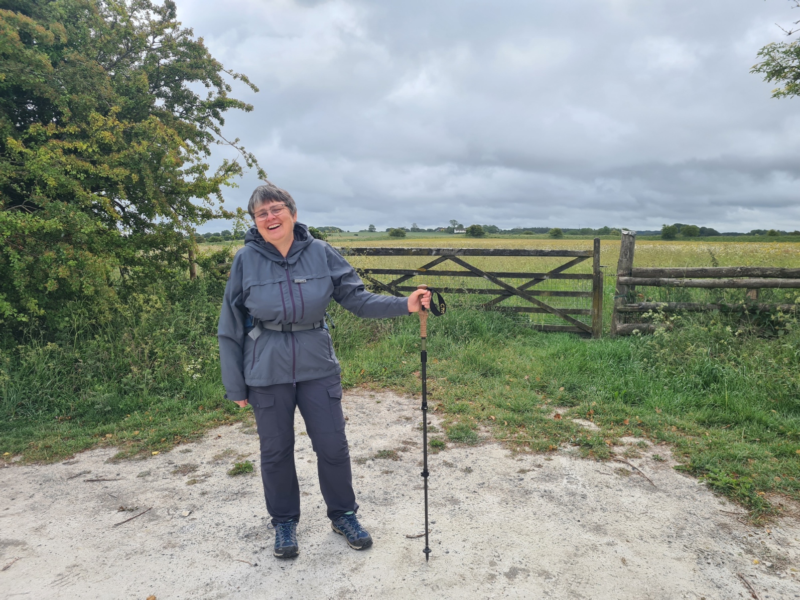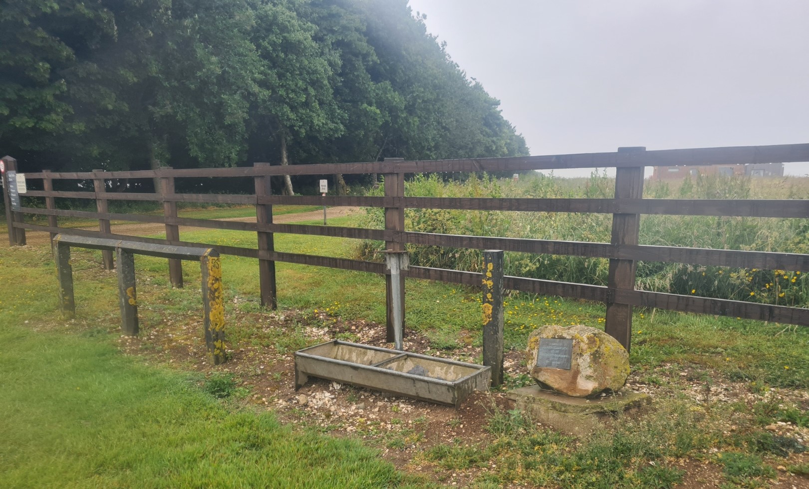 We took a few minutes out to view the Wantage monument. This was actually built on top of a neolithic long barrow. The stone steps to the column were wet and greasy and care was required not to go clattering down them. At times it bucketed down, at other times I uttered the much repeated words “it’s clearing up” as the sky brightened for half an hour before becoming an angry grey again. Occasionally we caught sight of the other four, at first far behind, but inevitably, given our slower gait, they caught up and passed while we were taking one of our periodic pauses, having found what seems to be uncommon on much of the trail, i.e. something to sit on. In this instance a few logs at one of the car parks occasionally found at infrequent road crossings. Two of the four hikers were having a hard time of it, feet hurting.