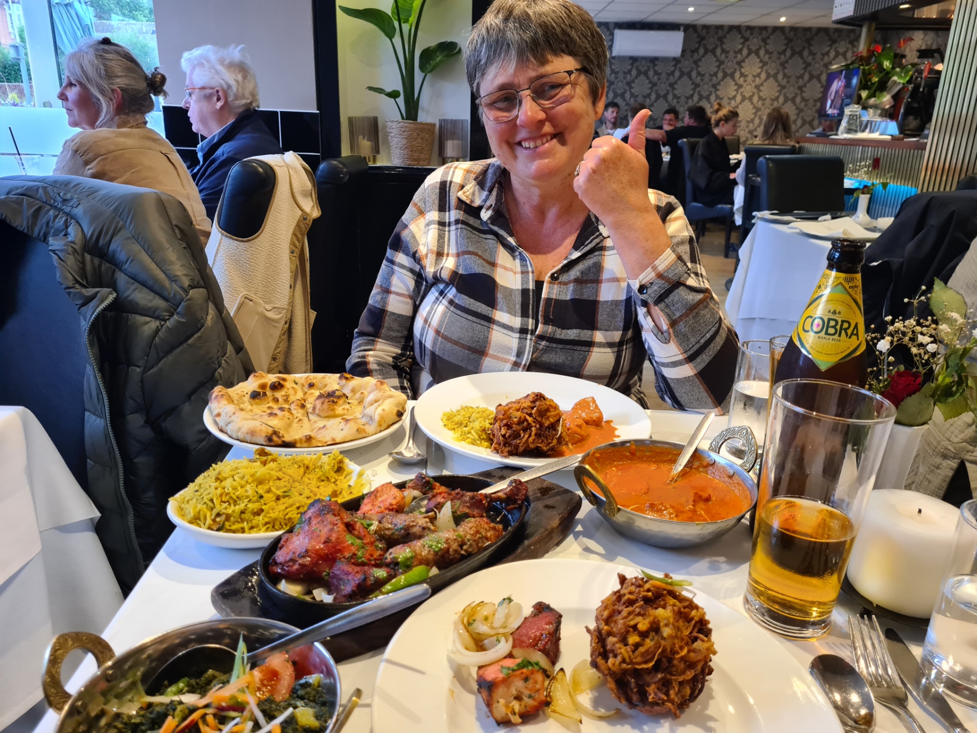 Showered and changed into dry ‘town clothes’ from our suitcases, we were back out two hours later to walk back in to Goring to the Indian restaurant Masooms. We had eaten here before and had thought it good enough to return. Many reviews report that it is the best Indian food in the district, but I would call if more ‘OK’, than ‘the best’. That said, the two of us enjoyed our meal (and Cobra beer) and waddled back to our accommodation having eaten far too much. It had been a fairly long and pretty wet day, but spirits are again high, feet and muscles are good, and we are looking forward to getting back on trail tomorrow, despite it being another 15+ miler.