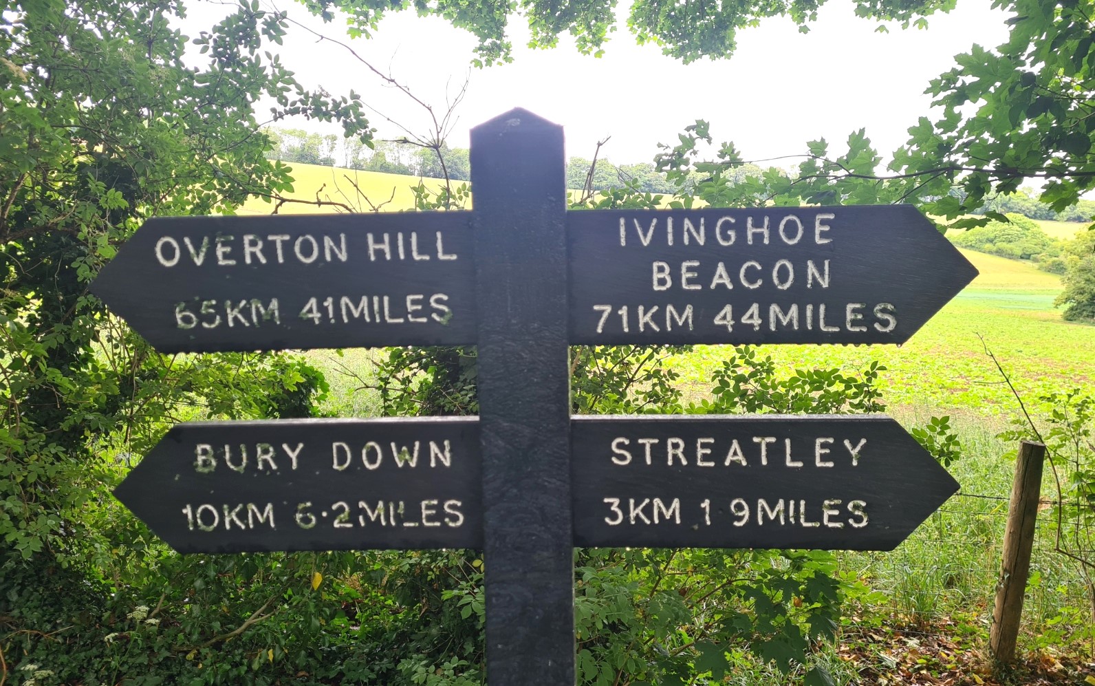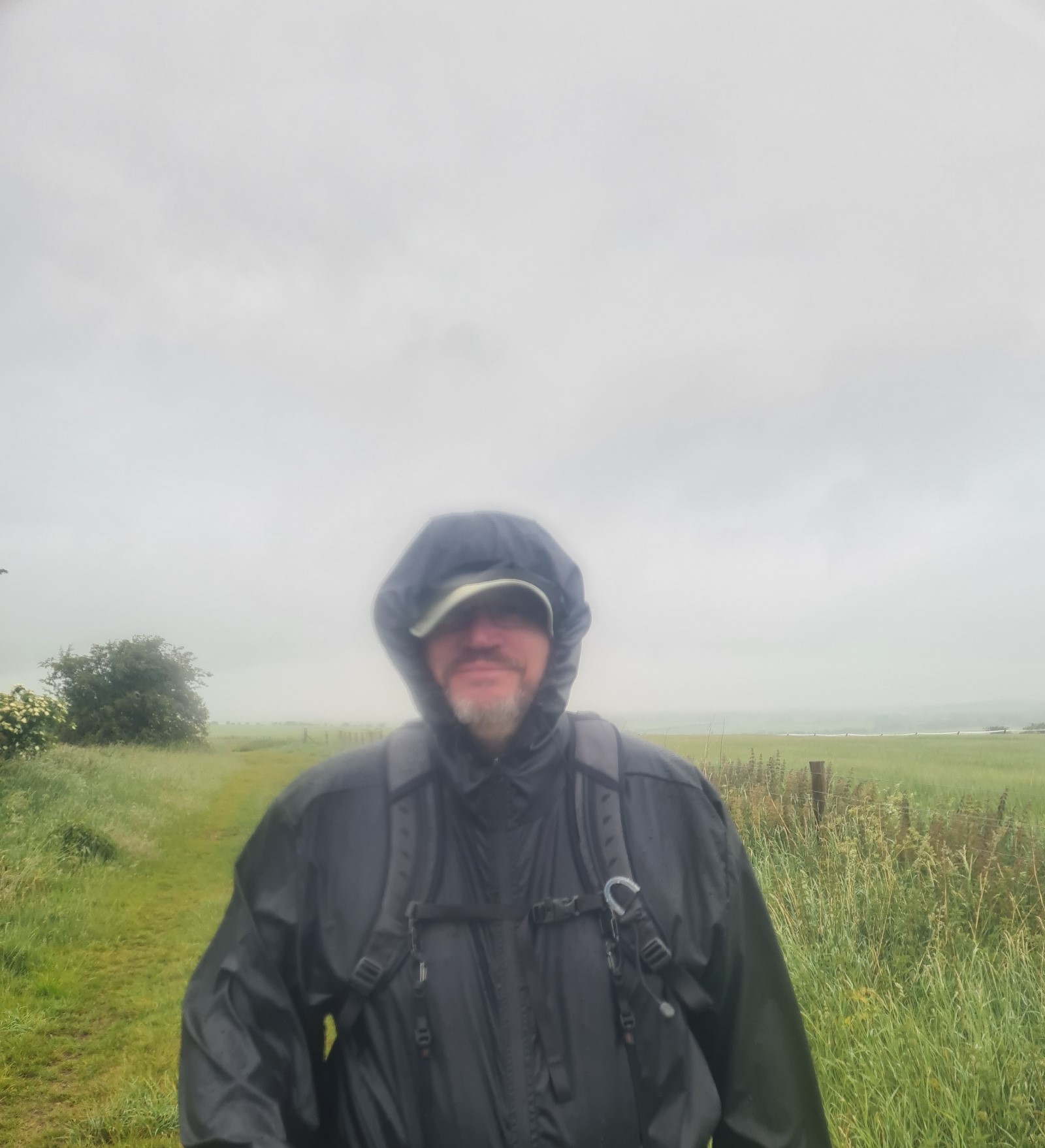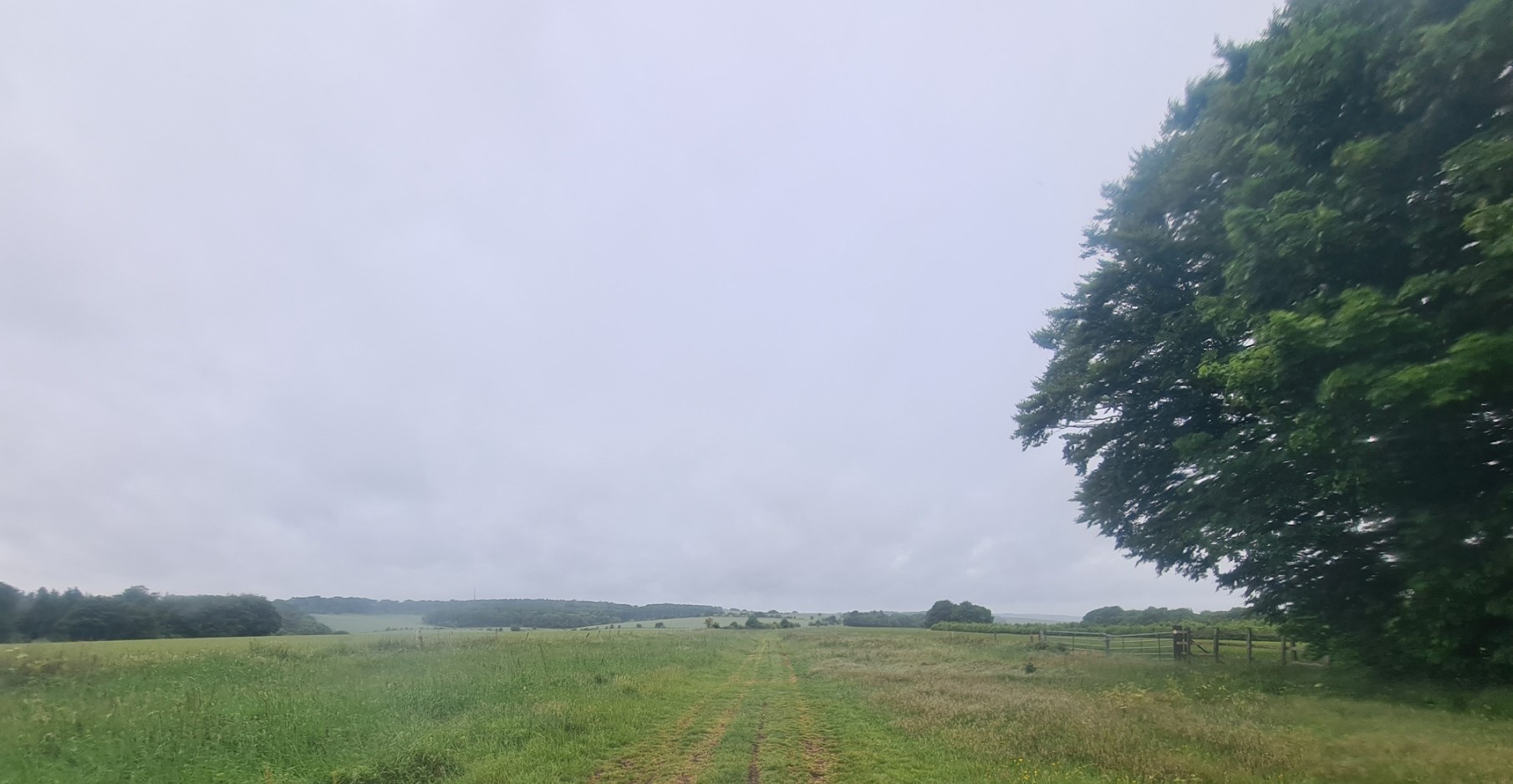 Today was going to be our longest day so far on this trail, with a bit of added mileage expected for both prior to rejoining the Ridgeway and leaving it this afternoon for our overnight accommodation. Richard and Louise at Quince Cottage really have been the most pleasant and helpful of hosts and we were very fortunate that Richard offered to drive us up the steep hill and return us to the Hill Fort at the top, almost back on trail. We passed the other four Ridgeway walkers on the drive up. So not only were the two of us denied the climb up, but we were also now leading the charge. Within a minute of waving off the car as it accelerated back down the hill, we were back on the Ridgeway. The soft rain persisted for the next hour or so, but it wasn’t anything onerous. At least not to start. It began to get heavier which meant I took few photos today. There wasn’t really much to see for most of the day. More quiet lanes, increasing numbers of trees, mostly beech and a lot of mixed hedgerows, more easy pleasant walking. But that rain. It just kept falling.