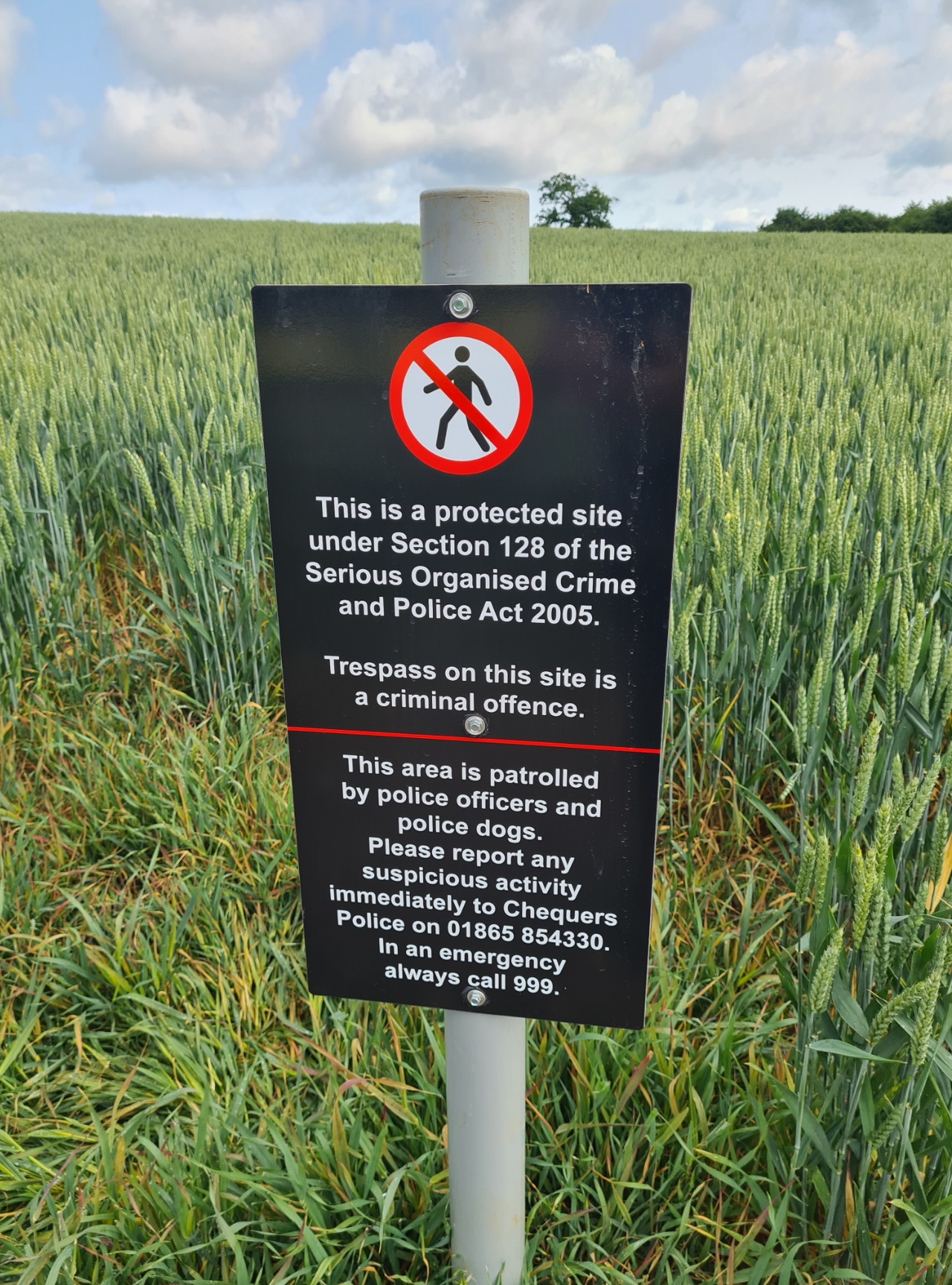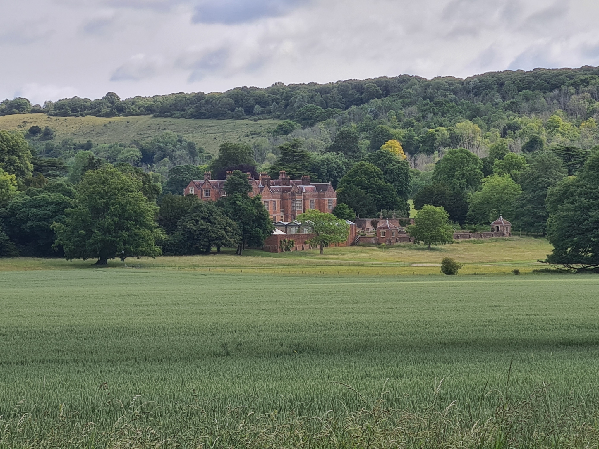 Our trail dropped down, swung around and we followed the edge of a cereal crop field, with a low metal fence edging. A 16th century manor house was visible across the other side of the large field. Further on and the path turned left through a gate in a hole in the hedge and a wide path led across the field. Stark notices were placed along the edge warning against trespass. This is Chequers, official country home of the serving prime minister. It was gifted to the nation in 1917. The Ridgeway crosses the private drive that leads up to the house from the gate house. It all seemed a bit daft to actually be within the guarded area but I am sure there is a battery of cameras and the like watching to make sure no hikers with political issue suddenly decide to march off to have a word with whoever is at home.