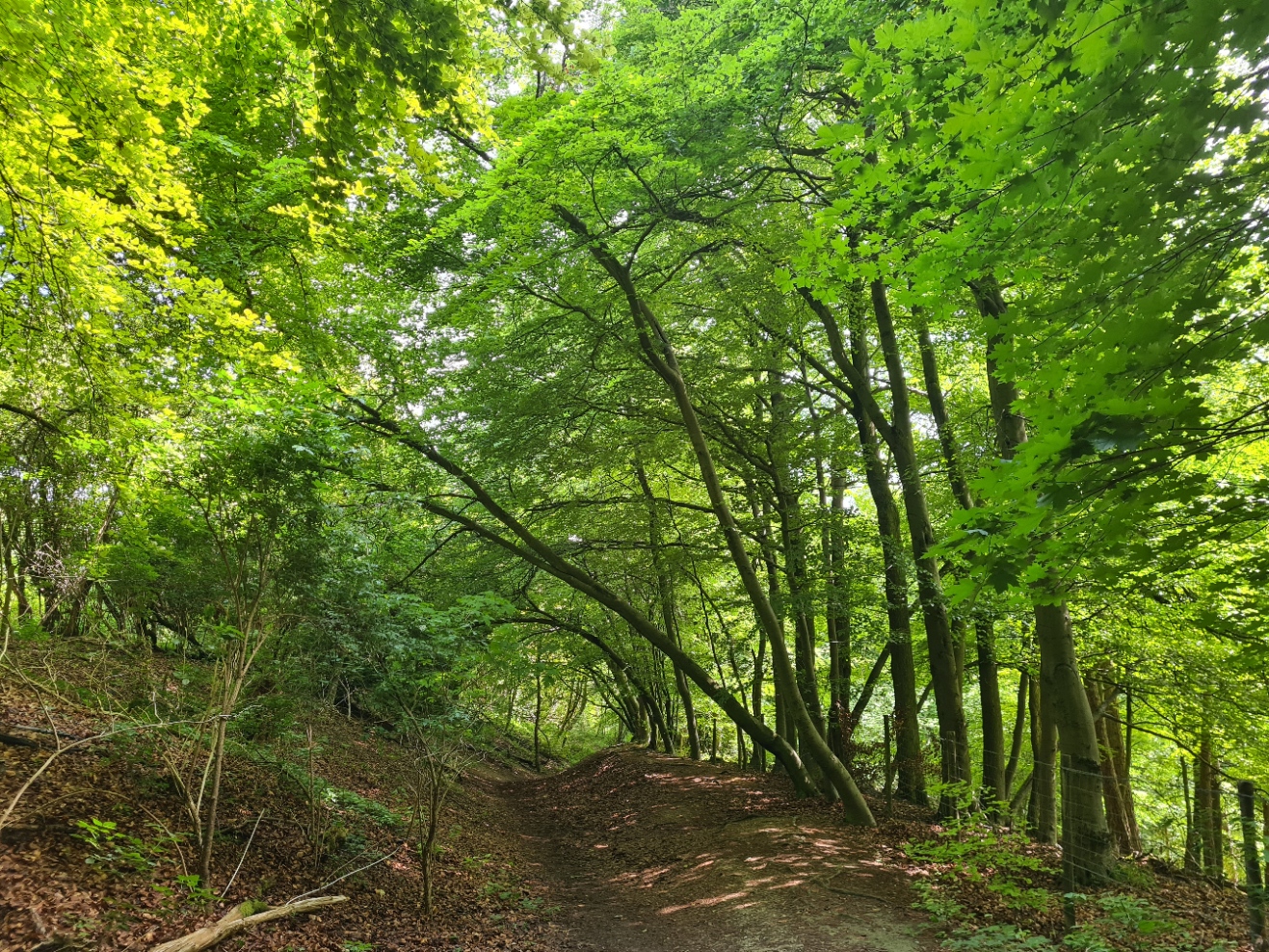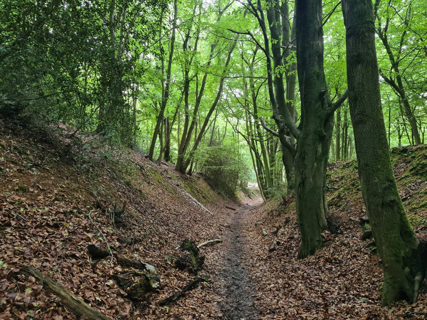 We were back in Wendover. For the first and only time on this trail, it looked like we would actually have a café to stop into for a brew. The Ridgeway usually steers clear of towns and we were determined to make the most of the opportunity so, despite the pressure of having to complete todays section early, we paused for a half hour in Rumsey’s chocolaterie. Away again, we walked past the Red Lion, where we had stayed last night and had left four hours previous and followed a track beside a stream out of town, the Heron’s Path, past a farm, then again into beech woodland. Following the edge of a quite steep hill we began a steady climb up a sunken bridleway though I doubt many horses are coming this way as there were a few trees fallen across the path.