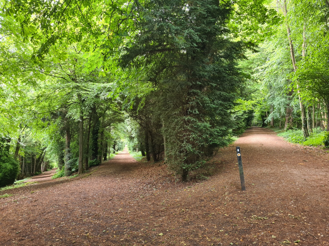 It got a bit scrappy for a couple of miles. There are various paths, even a nature reserve, but it seems to be an uncomfortable routing through messy farms. Passing through one woodland it was around lunchtime and we struck off sideways to emerge on the edge of a famers field where we sat in the tall grass to eat two day old sandwiches from the Watlington Co-op. Setting off again, back through the remaining woodland, we emerged on to a lane and, entirely my fault, followed it round to the left when we should have turned off right on to another lane. We backtracked the couple of hundred metres after I finally noticed and continued down the right lane before turning off again, to enter Tring Park. This is a large area of broadleaf woodland and grassland that dates back to the Normans. I was hoping to catch sight of one of the elusive edible dormouse, Glis glis, that live here following their introduction by Lord Rothschild in 1902, but it wasn’t to be. The Rideway follows a long and straight Lime tree bordered former carriage ride through the grounds, where we were passed by a huge group of walkers heading the other way. The avenue we were on is known as the King Charles Ride but others branched off. It seemed to be a popular place for families out for a Sunday stroll.