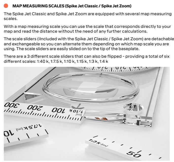While simple to use, the short 60mm length of each measuring slide limits practicality. The chosen scales are also of less use to the majority of those simply walking in the countryside, as the majority of map scales used, at least in the UK, are 1:25 000 and 1: 50 000, as used on O.S. Explorer and Landranger sheets. Hence their inclusion as permanent features on more recent compass baseplates. Some compasses might also have a 1:40 000 scale included on the baseplate. This is the scale frequently used by Harvey Maps. However the Type 2 doesn’t have that, so the one 1:40 000 measuring slide with that scale does open it up for use with those maps. The chosen scales on these measuring slides are more designed for use by orienteers and adventure racers working off those specialised map scales.