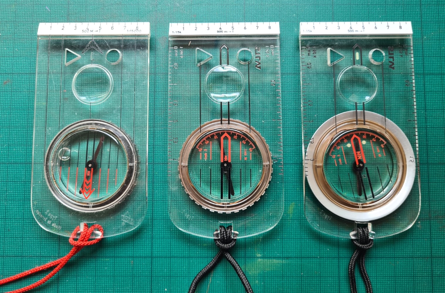 Silva’s compasses have changed a great deal over the decades. Changes in design and the addition or removal of features has created an often bewildering variety, with models with the same ‘Type’ number differing from others. I show three Type 2 compasses here, each with removable map measuring slide at the end of their baseplate. This model was also available without this feature. The earliest Type 2 shown here is quite a simple compass, but has the additional removable map measuring slide. In addition to other changes, such as the addition of a declination scale, the Type 2 3NL in the centre has had 1:25 000 and 1:50 000 measuring scales added to the sides of the baseplate. The Type 2 NL, on the right, with the same two scales on it’s baseplate, is the most feature rich of the three, with luminous paint for night time use and 6400 mils on its metal bezel in addition to the usual 360° increments.