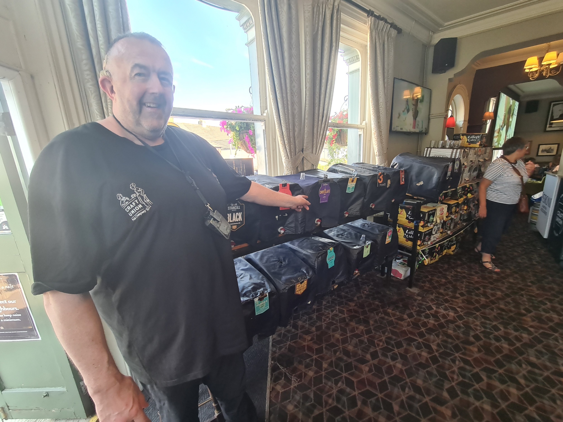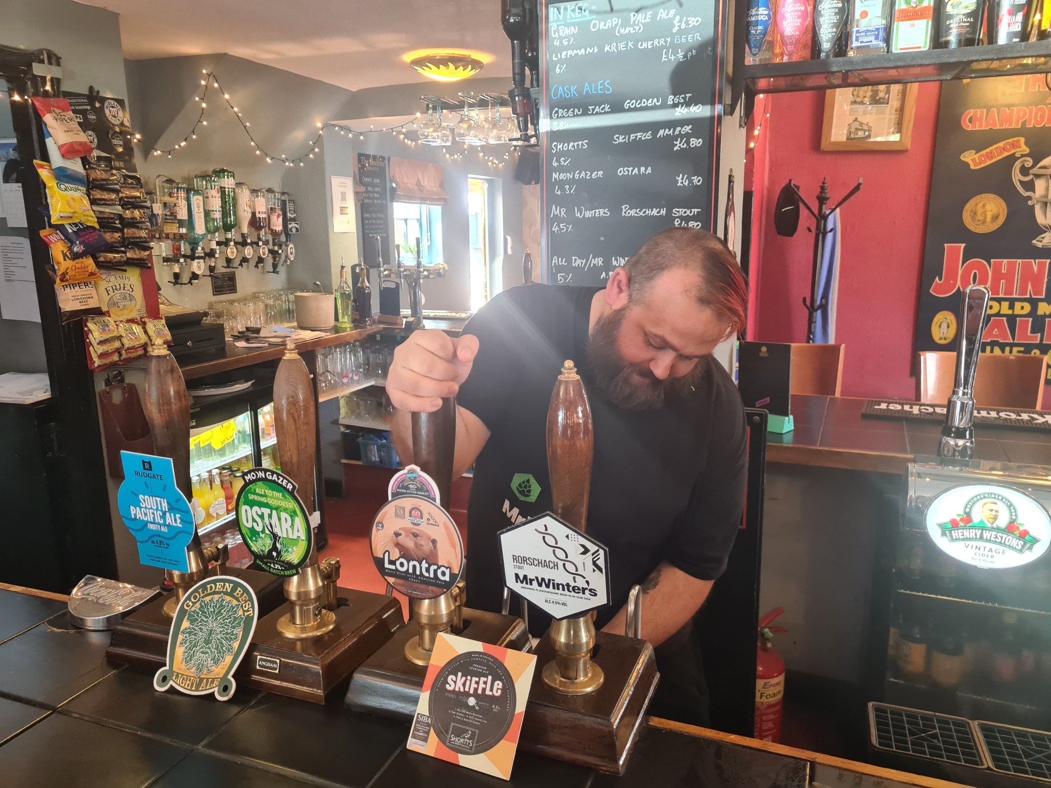 Jonathan shows off his ‘extra’ barrels. At least 12 cask beers are usually available.