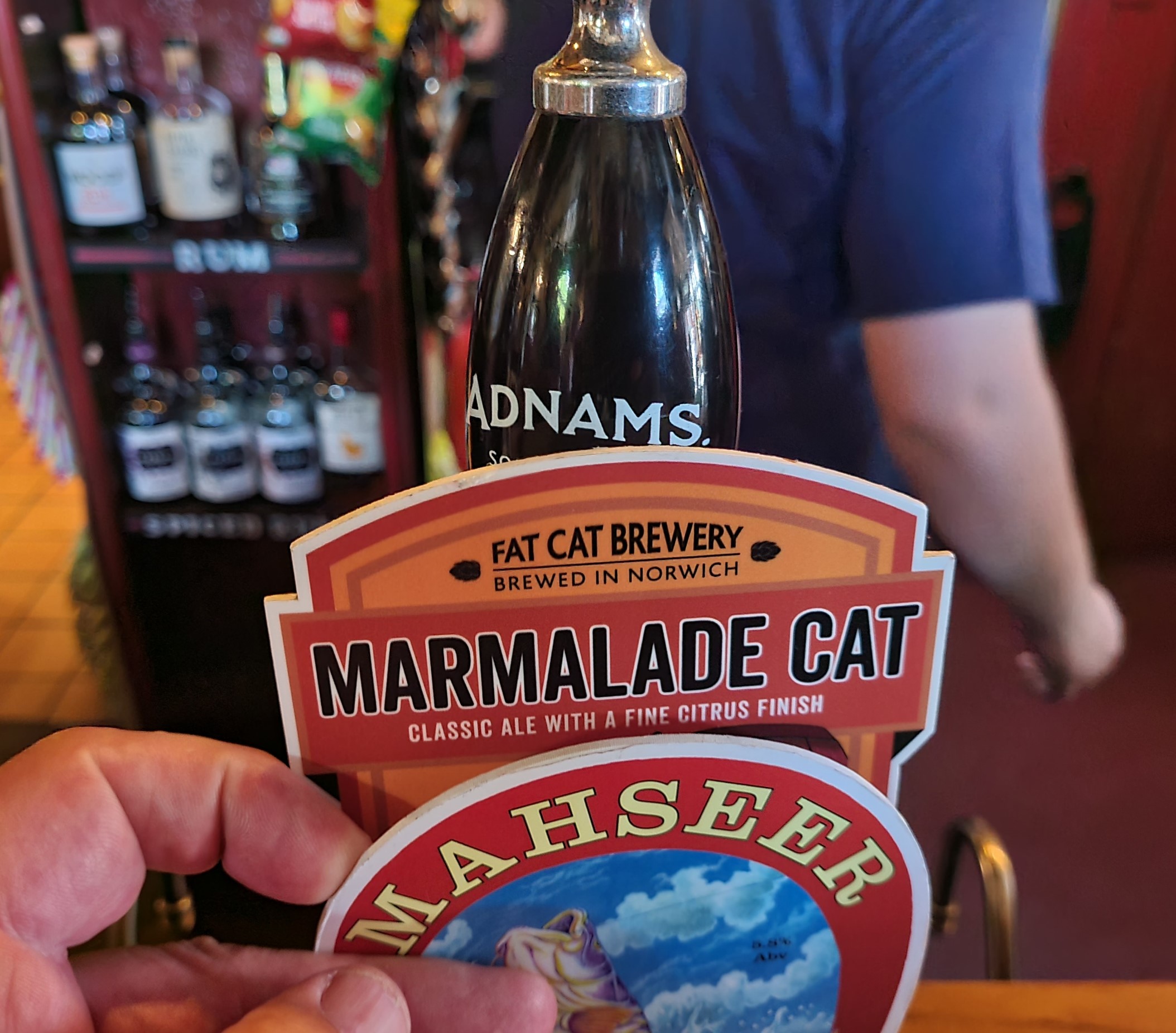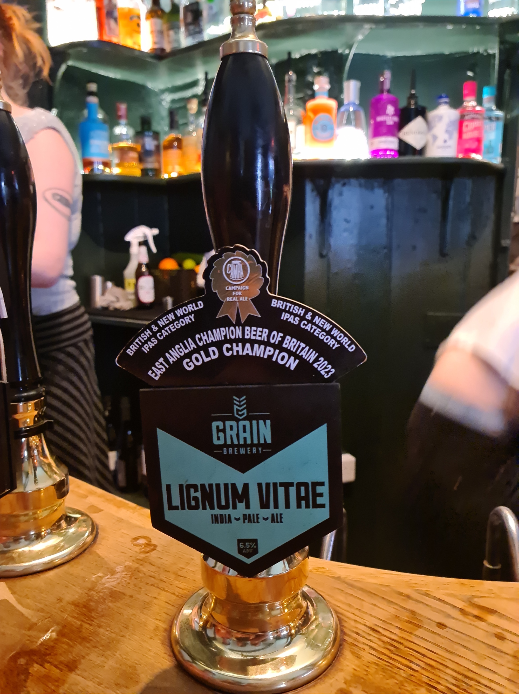My journal notes record my initial impression of my pint: “a superb beer, best of the afternoon…”. This is perhaps unsurprising as it was East Anglia Champion Beer of Britain in the British and New World IPA category in 2023. Also Champion Cask Beer of Norfolk for 2024 as voted for by Norfolk CAMRA members. At 6.5% I was a little wary of having a pint of this strength at this point in our beer trail but threw caution to the winds and am thankful I did. It’s lightness belies it’s strength. but it has aroma, upfront bitterness, the usual (these days) over-notes of citrus and tropical fruit, with a lingering aftertaste. As with many other beers these days that eschew traditional bitterness in favour of the all-pervading supposedly inoffensive “citrus notes”, I was pleased to see this was a decently hopped and not too fruity beer. As a brew, it began life way back in 2010, then called Tamarind IPA, but was renamed as people confused it with a hot sauce, like you do!