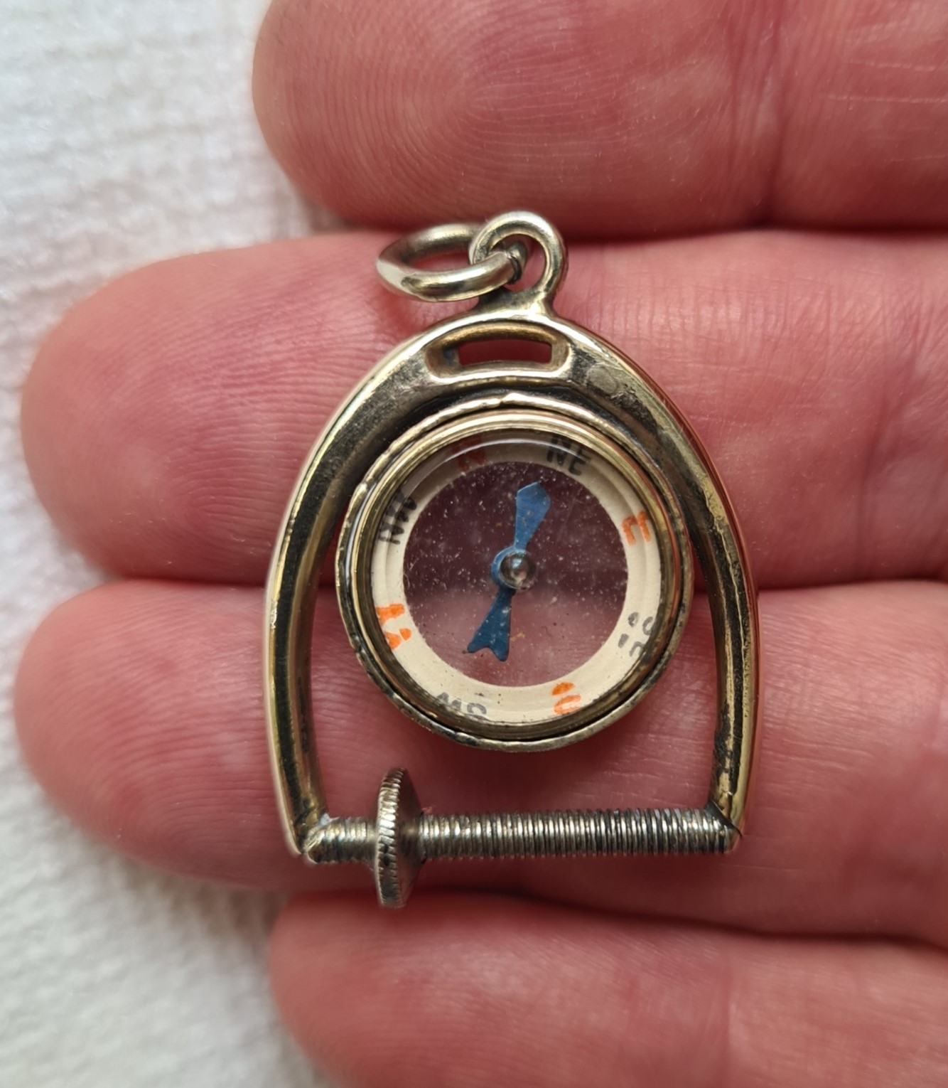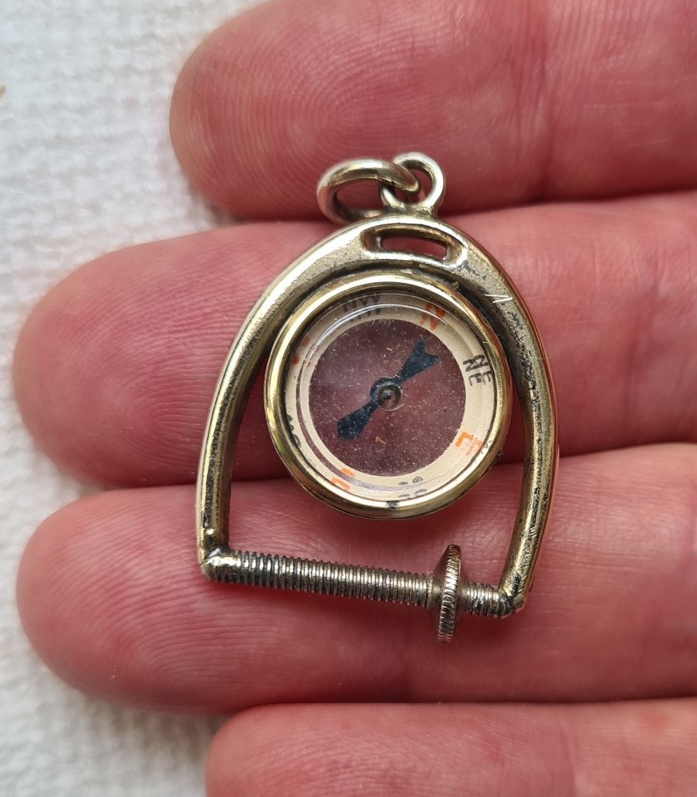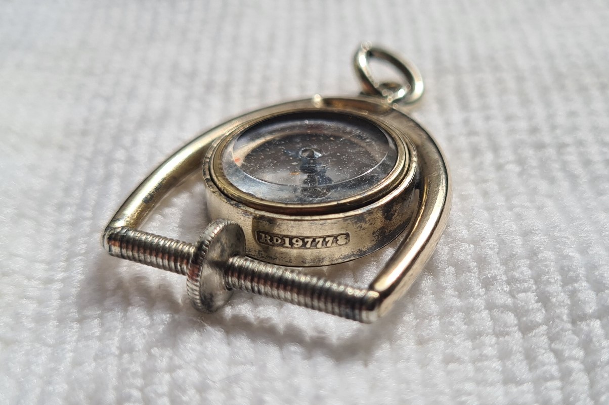 This little tool combines a basic compass with a simple map measure. There isn’t much to it. A curved metal hanger supports a threaded bar at it’s base. There is a ring at the top to enable this to be attached to a gentleman’s watch chain. The spindle has a knurled tracking wheel, used to measure lines on a map. It is an opisometer, if a very basic one. In addition, there is a transparent compass centrally mounted within the hanger. The 16mm diameter compass has flat crystal faces on each side, with chamfered edges. It is a press fit into it’s silver housing. Only cardinal (in red) and inter-cardinal points (in black) are shown on each side, with a blued arrow needle indicating north. It is not liquid filled but the needle settles quite quickly.