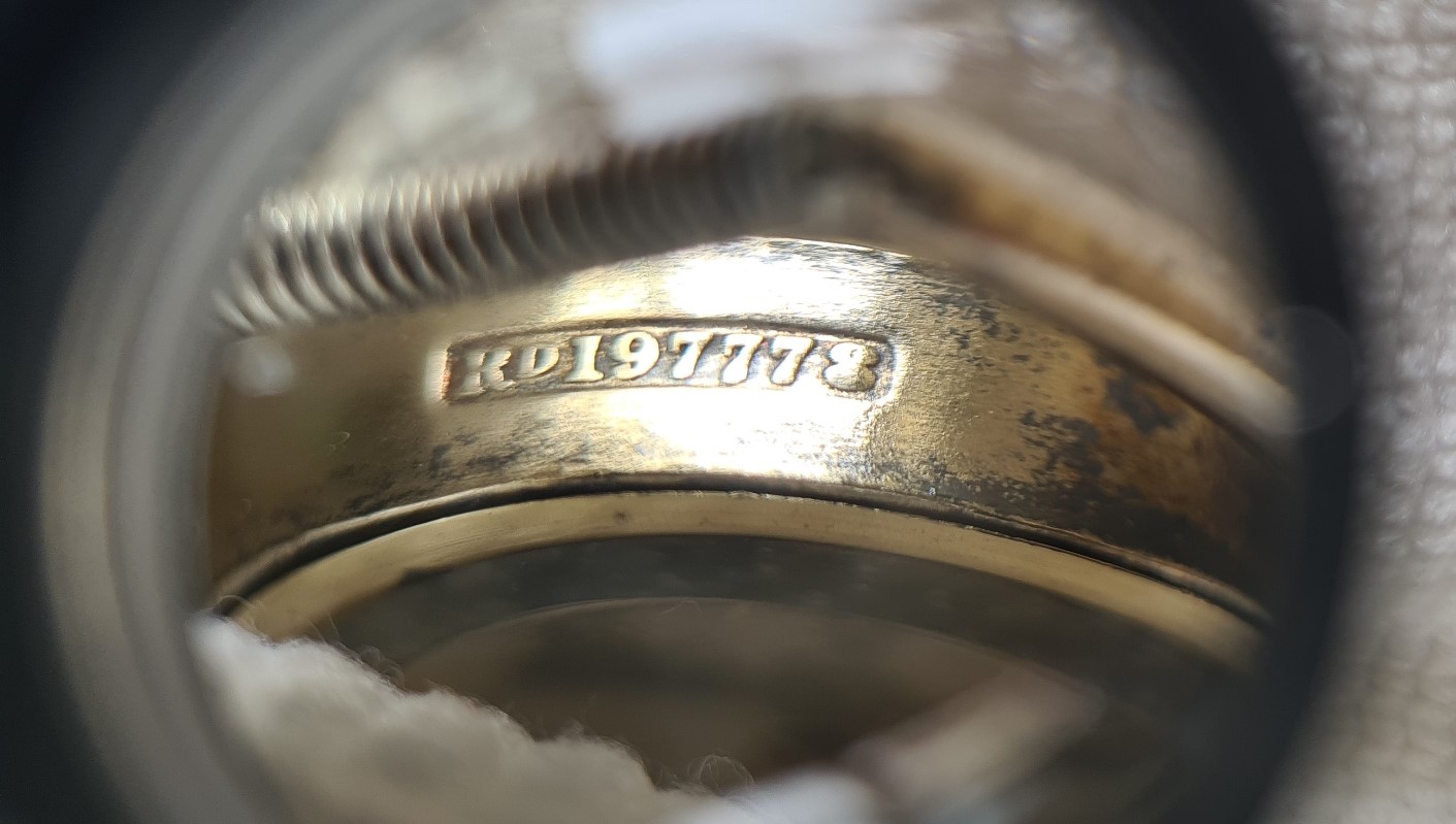 Despite the metal hanger having no magnetic attraction, there is no hall mark on the example shown here, so is likely silver-plated. The registration mark is shown however. This is RD197778