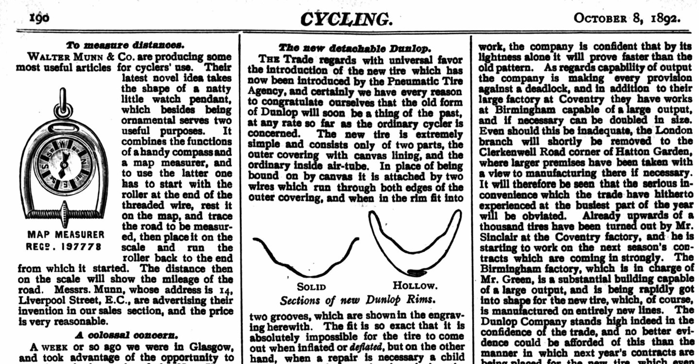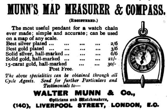 Walter Munn & Co. was a jeweller, operating out of 14 Liverpool Street, London. They advertised themselves as ‘watchmaker, jewellers and optician”. Munn was a keen cyclist himself and produced a variety of accessories targeted at cyclists. These included Eye Protectors, a watch-holder for mounting on handlebars, a ‘Speedograph’ watch, and an “ingenious charm for the watch chain, with a compass and map measure combined”. Munn’s Map Measurer and Compass was advertised in Cycling. This was a newspaper. published 1891-1920 by Future Publishing Ltd. in London, that catered to the cycling fraternity. It reported on innovation and activities of interest to their cyclist readers and traders, also carrying many advertisements in a supplement to the newspaper.