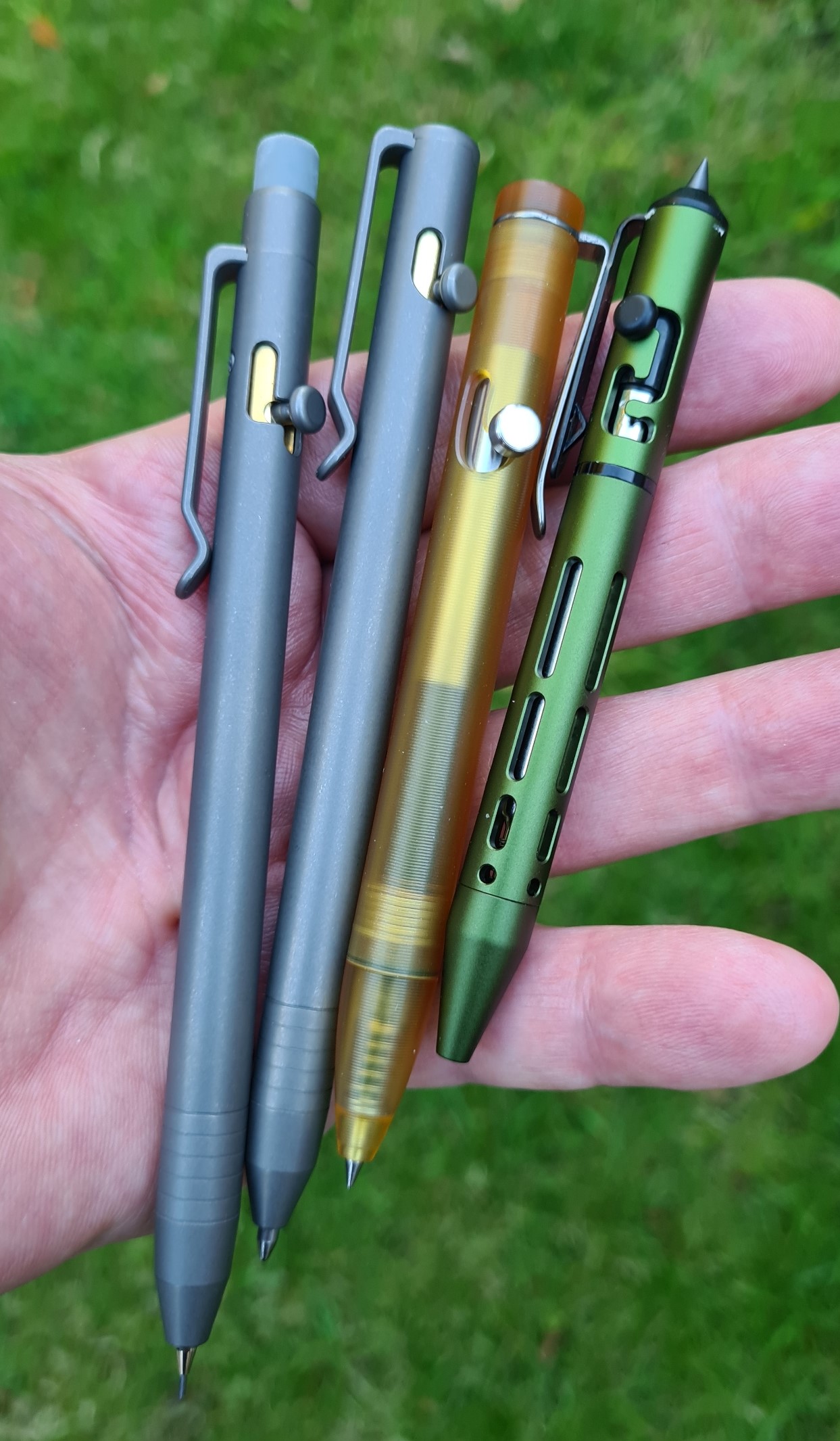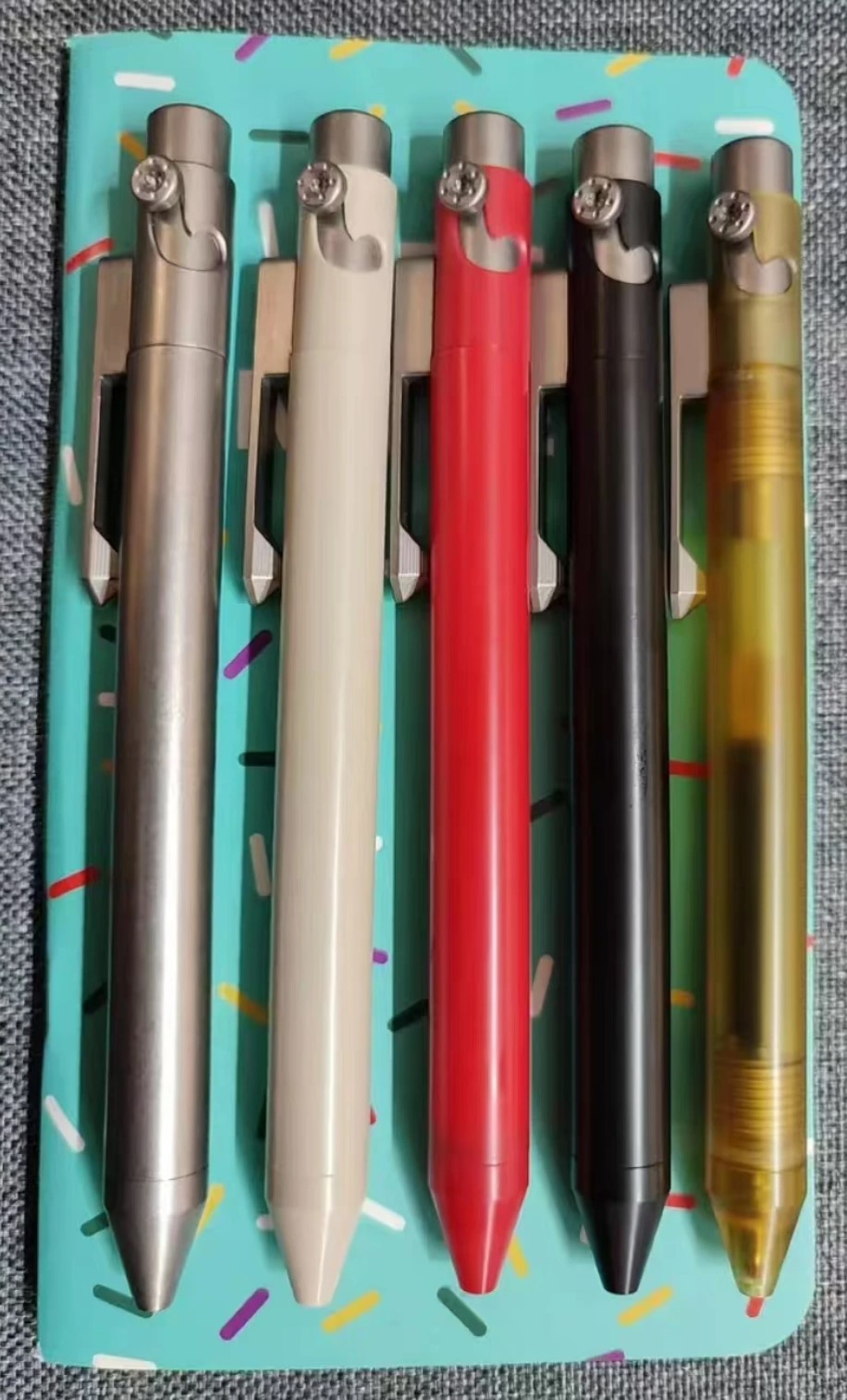 By way of example of how manufacturers attempt to fill all possible corners of a market, I include an image from one Chinese supplier’s online advertising. There are five of the popular ‘bolt-action’ pens, each utilising interesting materials. From left to right: Titanium (35.5g), Polyetheretherketone (PEEK) with titanium parts (19.7g), Polyoxymethylene (POM) with titanium parts (20.2g), Polyetherimide (PEI) with titanium parts (19.7g) and Polyetherimide (PEI) with titanium parts (19.5g).