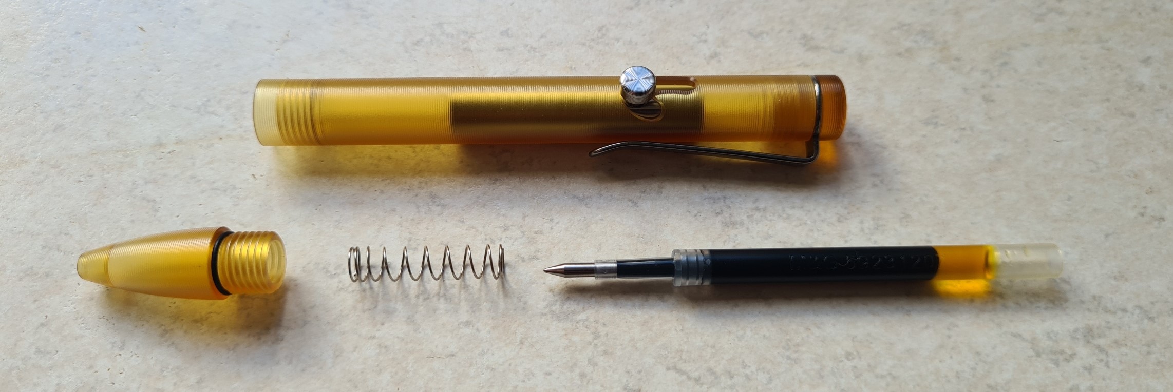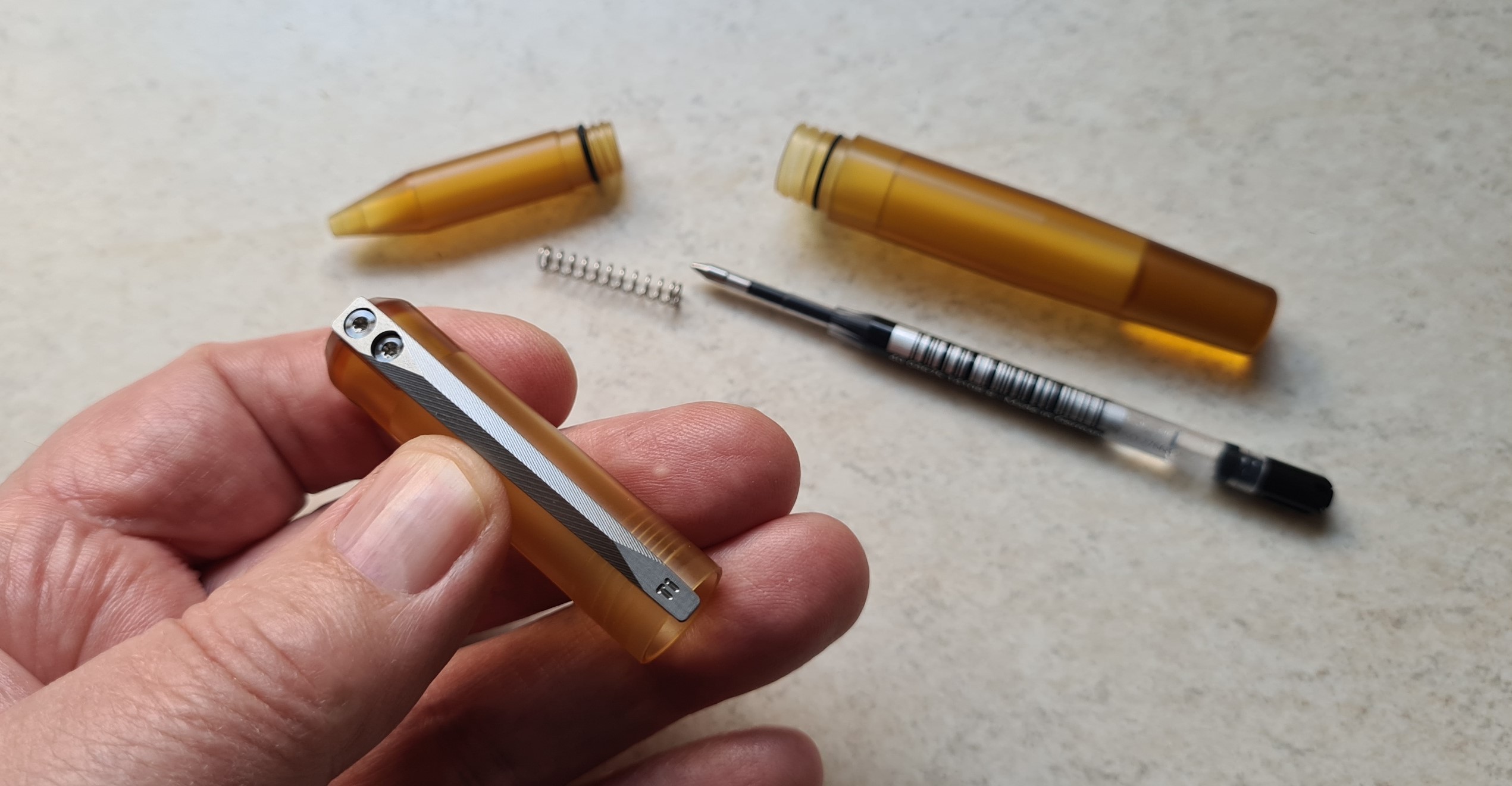 The pen is mostly made from Ultem PEI other than the 45mm deep titanium clip, two hex screws fixing this to the body, steel spring and O-rings. It weighs 20.9g with pen cartridge installed and measures 121mm in length with cap fitted, 117mm without. The grip is 14mm diameter.