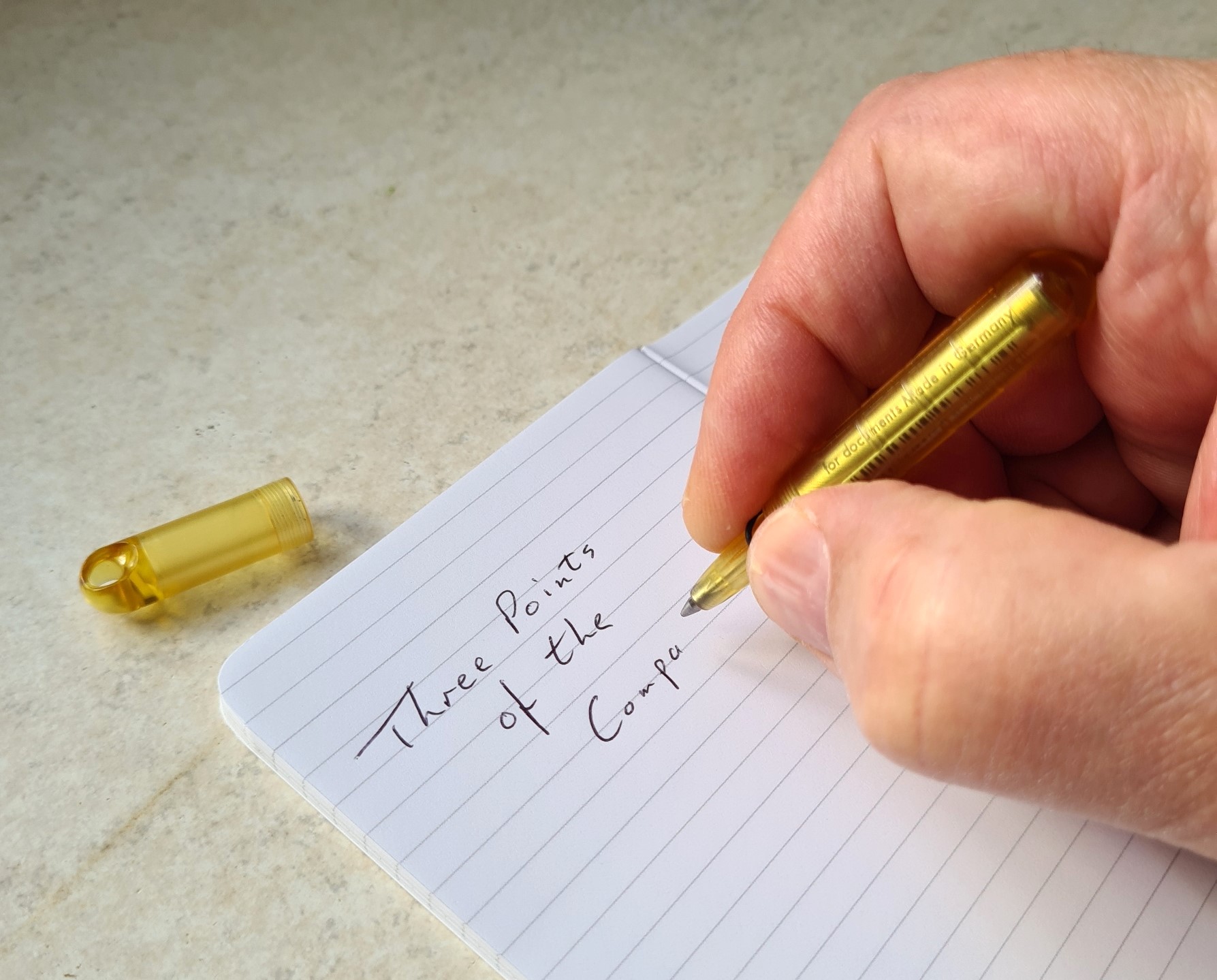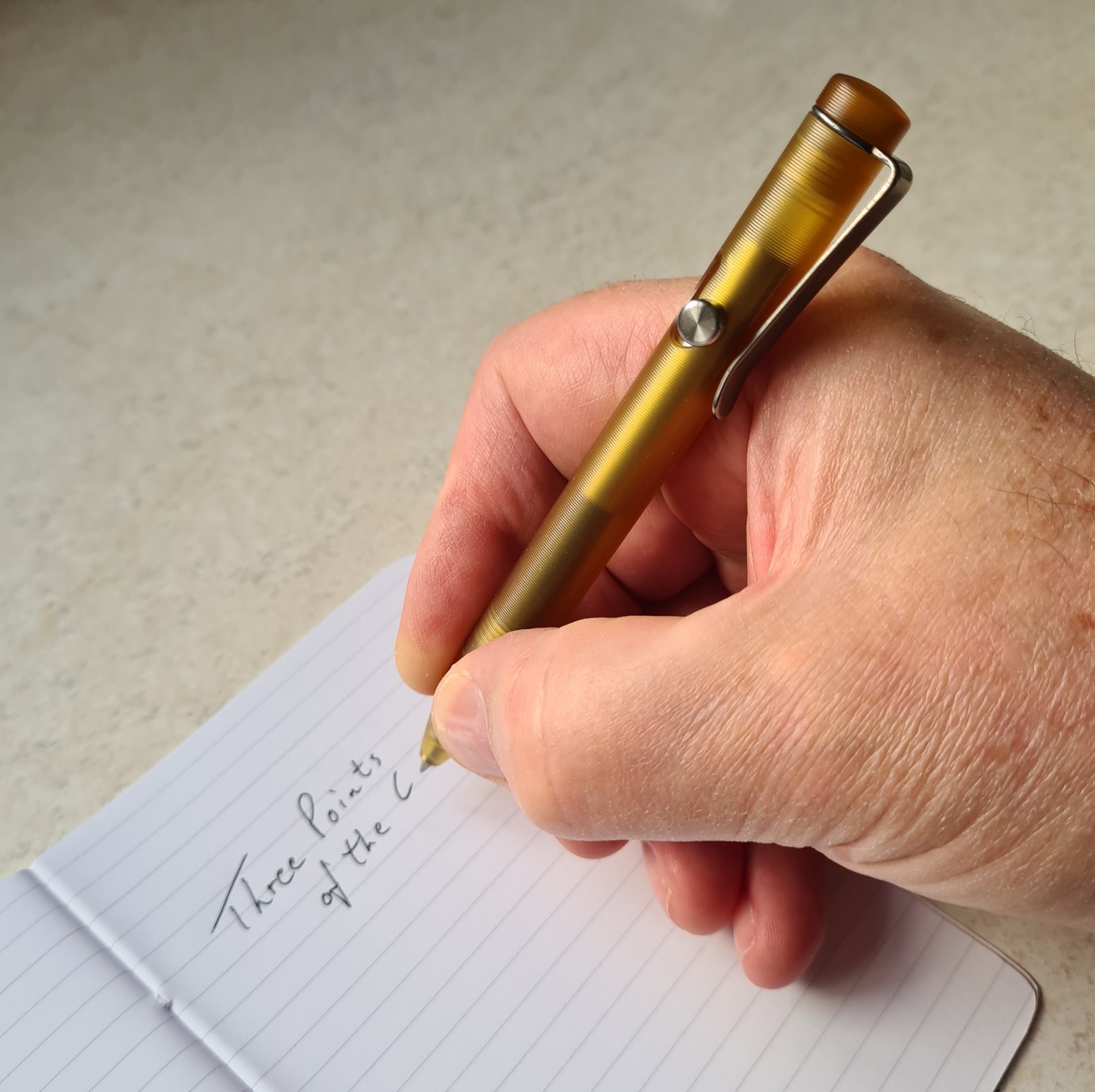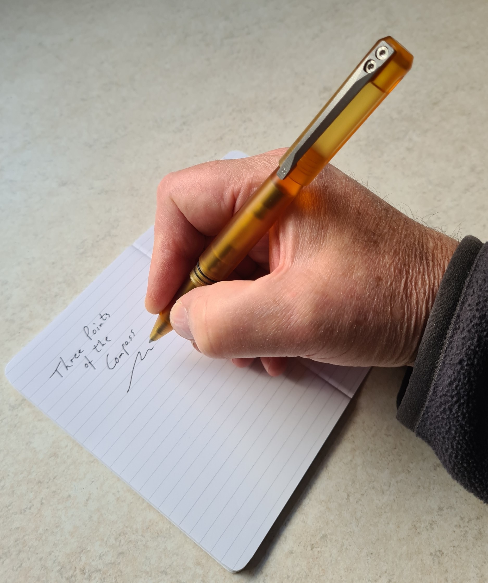 I found all three pens fine to use. They do get slightly more fiddly and difficult to use as the size decreases. But that would be the case regardless of material. I find very little to actually promote the use of Ultem as a build material over just about any other material that has been used in the past, other than for purely interest sake, or where extreme light weight is a primary importance. That is where one of the three shall find most use for me. The tiny Maratac pen, despite being over-priced for what it is, now takes its place as my favoured on-trail pen for lightweight backpacking. The increased awkwardness in use is countered by it’s slight weight. This is not intended for writing essays, but for scribbled notes in an equally lightweight journal. The decent capacity ink cartridge is also a bonus as many small pens have a quite pathetic reservoir by comparison. As for the other two pens. The largest, the Signature, has simply joined my small arsenal of pens on my desk. The bolt-action pen would have become a suitable travel pen, however I prefer my existing options and will likely pass that on to Mrs Three Points of the Compass.