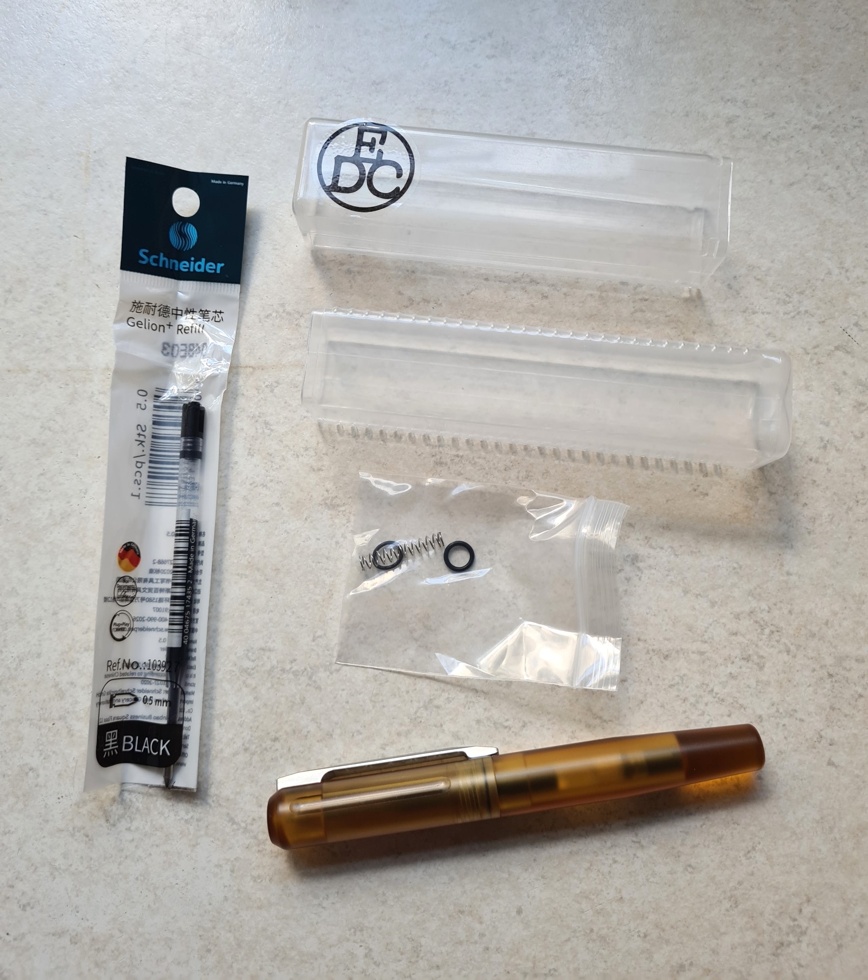 It comes with a German made Schneider Gelion+ black ink gel ball refill with 0.5mm tip installed. This is a waterproof, light-resistant ink which complies with ISO 27668-2. These are widely available, or use any equivalent size refill. The two part plastic tube that the pen is supplied with also contains a sealed spare ink refill, two spare O-rings and spare steel spring, all good to see.