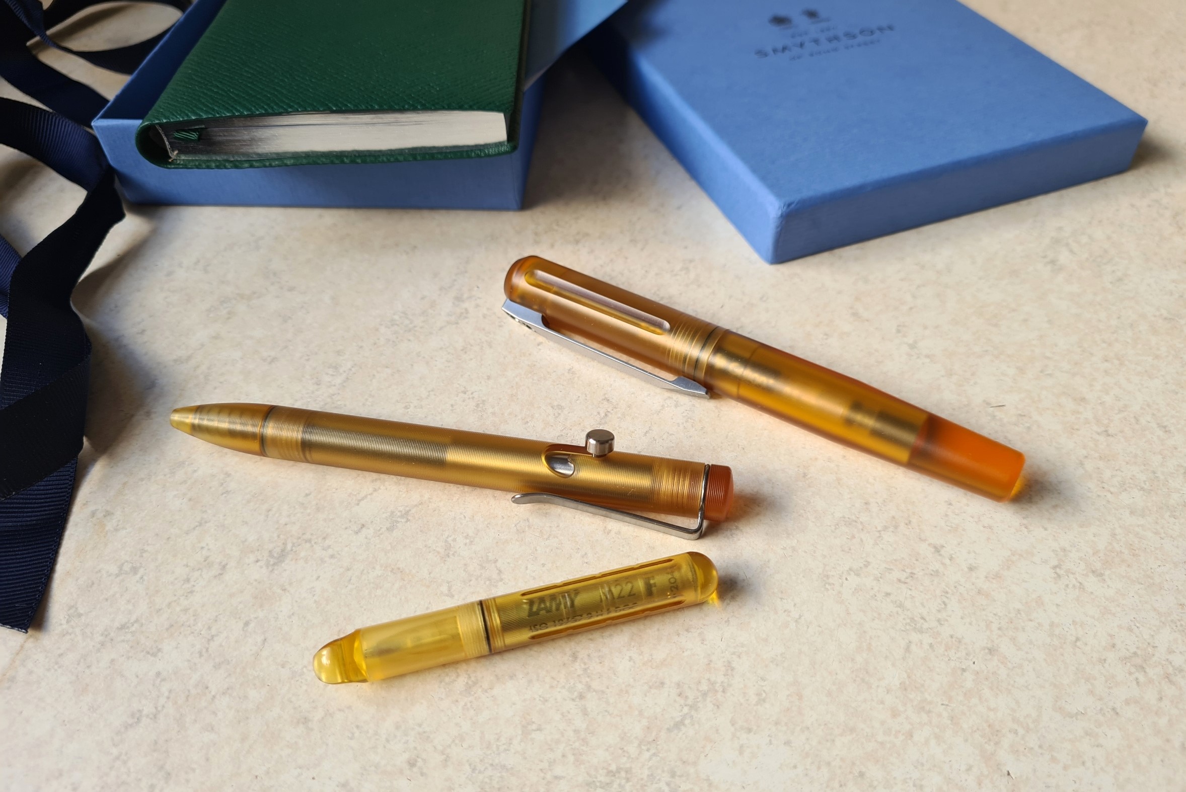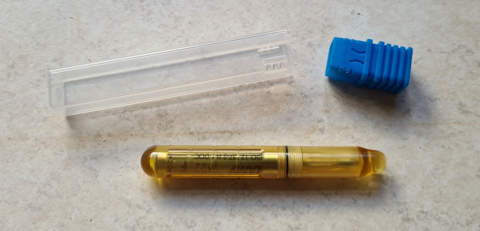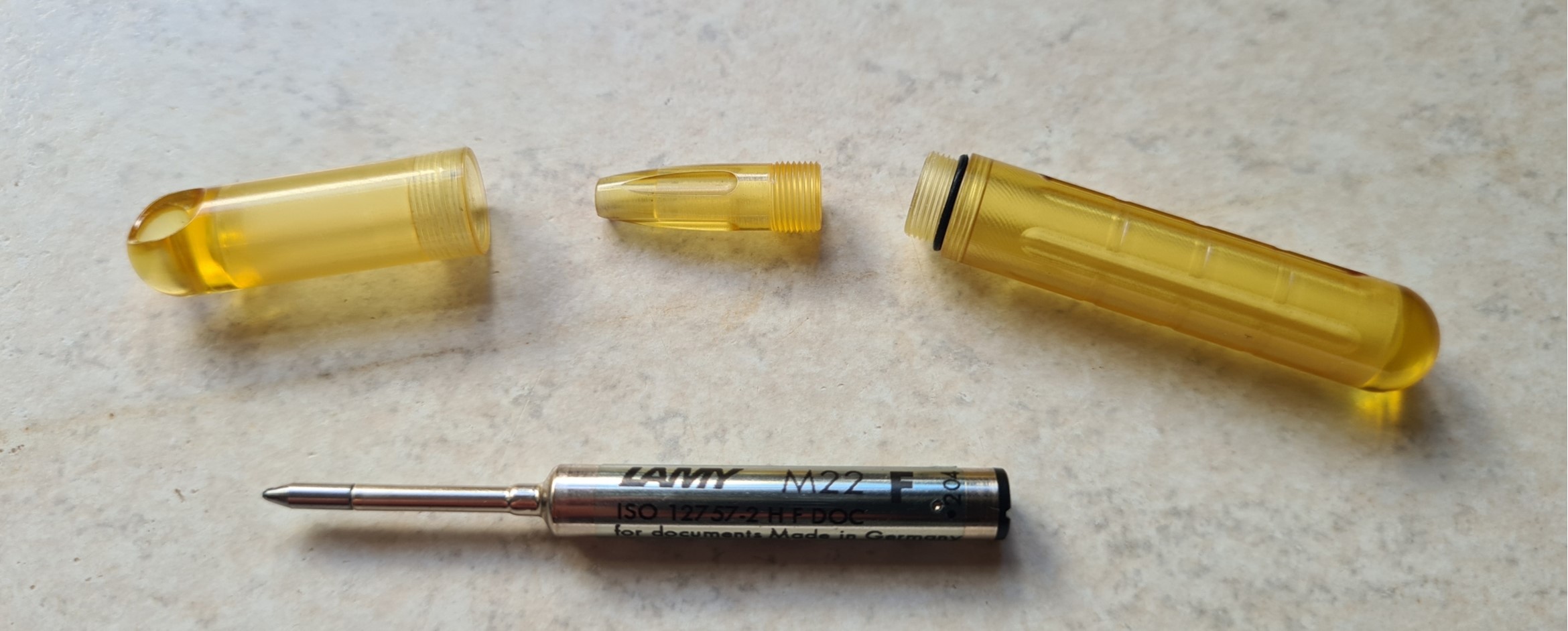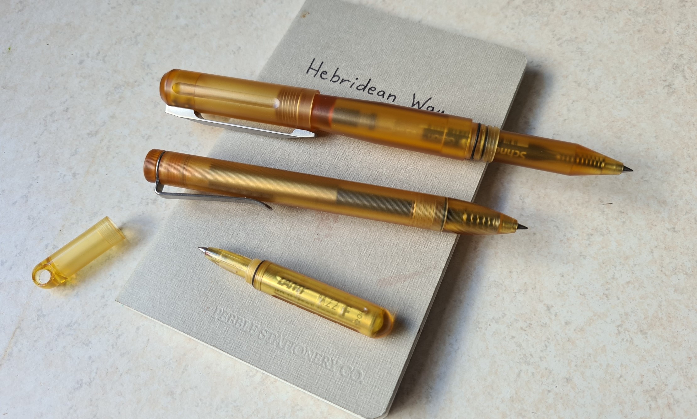 I am not aware of a gel refill that fits this pen but I am sure someone will put me right on that. The refill is itself 5.8mm wide, so could potentially be used as an even lighter standalone pen for those seeking extreme lightness, but is a bit uncomfortable to use as it is. But for just a few scribbled notes, why not. I have been using a Fisher Space Pen refill, with a couple of lengths of heat shrink tubing on the body, for years as an imperfect solution on lightweight backpacking trips. The M22 refill is rated for use in temperatures -30F to +250F. Sadly, the M22 isn’t the greatest of inks. It is non-archival and un-pressurised. There are many similarly made PEI pens available off AliExpress for a great deal cheaper, but in common with the previous two looked at, those all seem to be larger and heavier. Nothing made of Ultem/PEI, as yet, seems to be rivalling the compact dimensions of this little pen. Also in common with the Signature pen, the printing on the side of the refill shows through the transparent body, which is a brighter lighter yellow colour than the other two pens, though the cap is slightly more translucent.