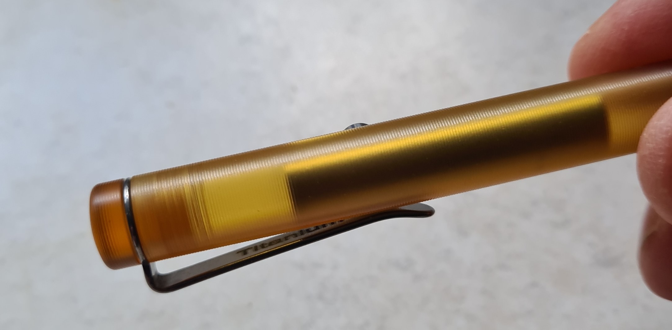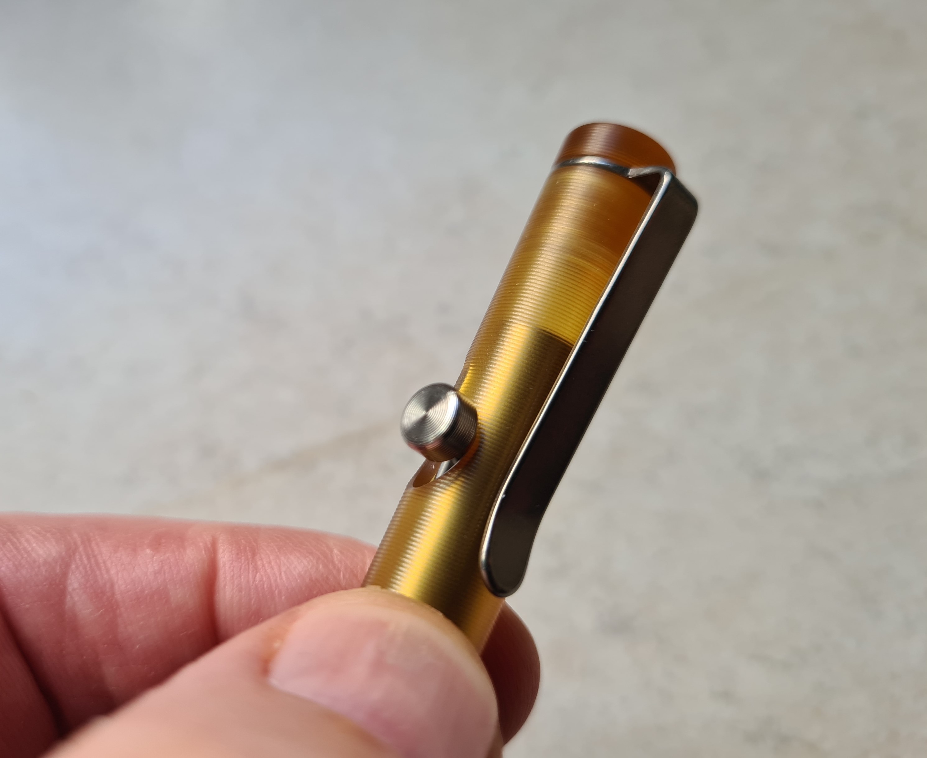 So, one seller advertises this pen as being Ultem, another as PEI. It just shows how some manufacturers are not bothered by branding rights. Again, it has an attractive transparent body, more translucent to my eyes, with steel bolt action and 37mm deep titanium pocket clip.