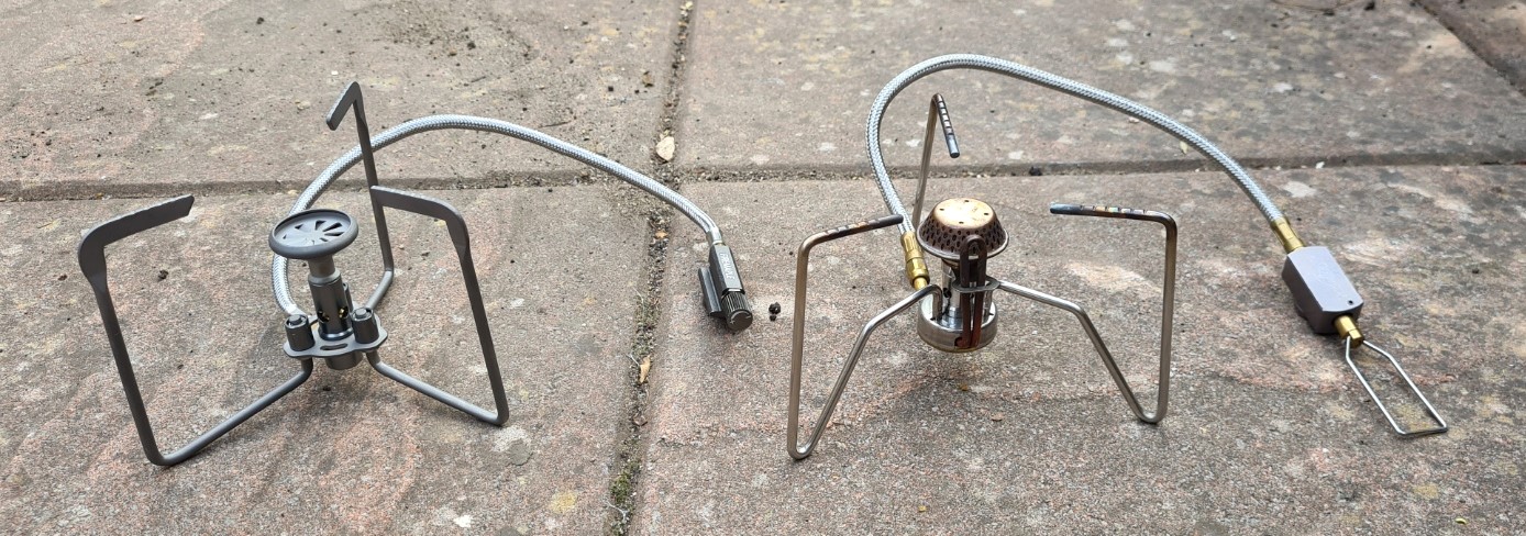 Fire Maple have quite a range of lightweight remote canister gas stoves, each with different features, and weights. Previously, their lightest have been the FMS-117T Blade, FMS-117H Blade 2 and FMS-118 Volcano stoves. The FMS-117T Blade is a primarily titanium, remote stove, without pre-heat tube that weighs 106g (advertised weight formerly 99g, later 103g). The FMS-118 Volcano (replaced by the slightly upgraded FMS-118A Volcano in late 2022) is a stainless steel remote stove with pre-heat generator tube. Advertised as weighing 146g, it is actually 155g. Finally, there was the best of the crop, the FMS-117H Blade 2. This is a mostly titanium remote stove, but also fitted with a pre-heat tube, enabling four-season use. Advertised as weighing 135g, it is actually 140g. The Fire Maple FMS-117H Blade 2 comes with a stainless steel generator loop. The model was also OEM prepared for sale by Alpkit as their Koro stove. The only difference of note was that the Koro came with a plain brass generator loop and the FMS-117H has an electro-plated brass generator. The Koro weighs 124g against the 140g of the Blade 2. In 2023 Fire Maple informed me that they were discontinuing manufacture of the lightest of these, the FMS-117T. I presume the Petrel Remote Stove was envisioned to be the bare-bones, lightest, titanium stove replacement in their catalogue. Not only is the Petrel lighter, but being a significantly different design, is also considerably more compact when folded.