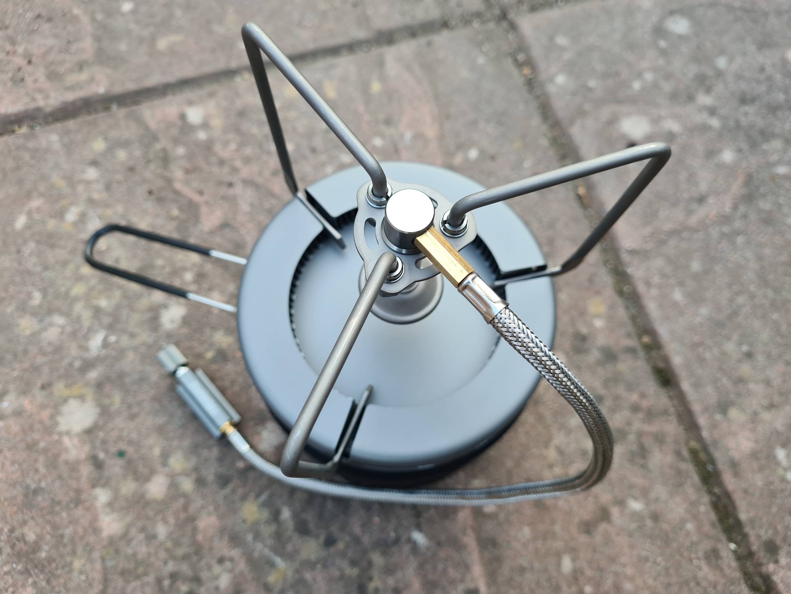 Despite it’s name, the Petrel Remote Stove is made of a mixture of materials. The legs and pot support arms are titanium, as is the burner head. The remainder are aluminium alloy and copper. But seeing as the great majority of the stove is titanium, this is where weight savings are made. The stove legs are round, flattened where they bend over to become pot supports. Fire Maple have added a few ridges to the top edge of the pot support arms but they do not amount to much.