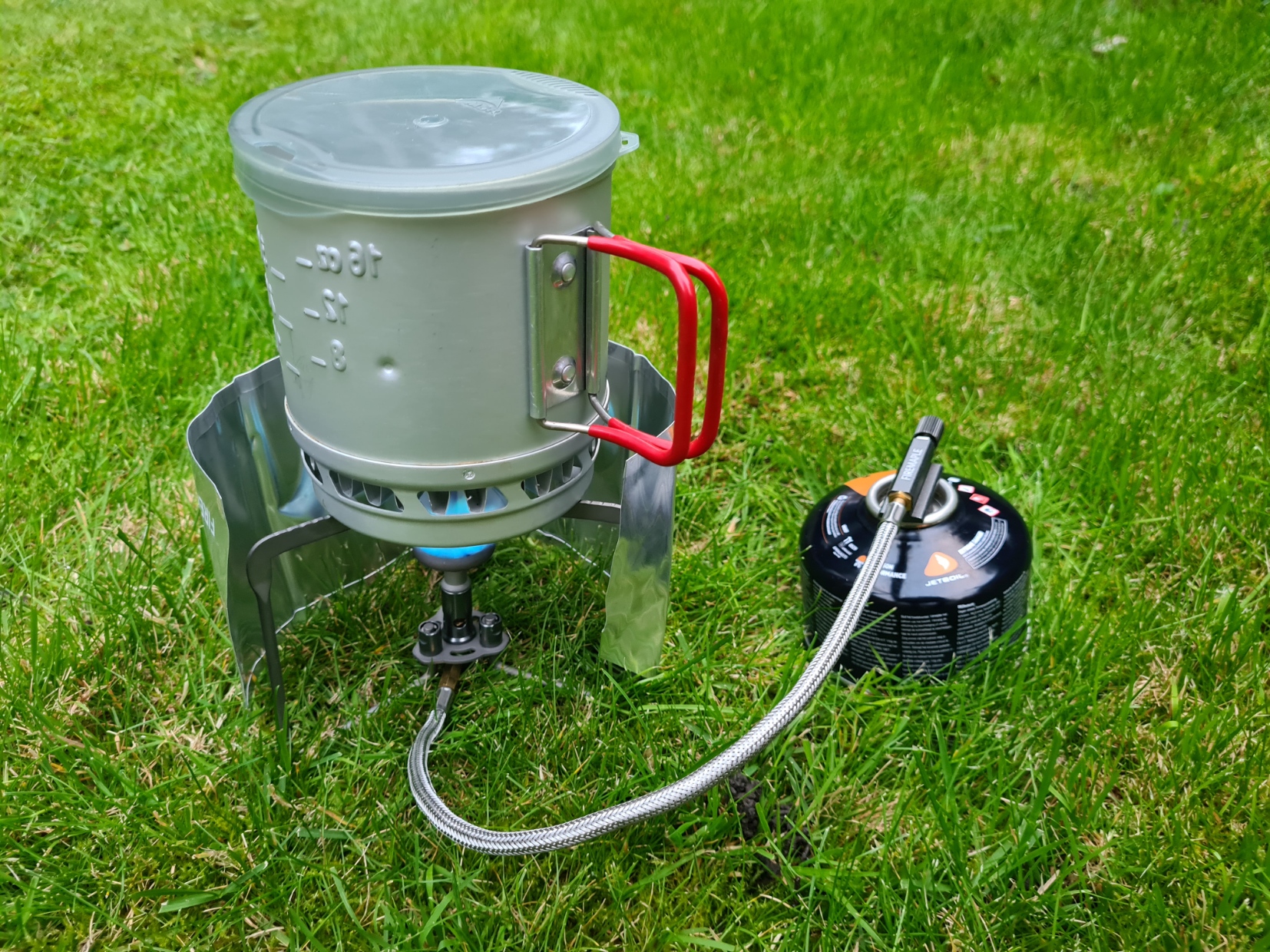 Combining the Petrel Remote Stove with Jetboil’s Stash pot probably makes for one of the best lightweight combinations possible, marrying together an efficient, reasonably wide-base heat exchanger pot with the lightest remote canister stove on the market. But would make for an unfortunately expensive combo. A cheaper option would be using one of Fire Maple’s innovative range of reasonably priced heat-exchanger pots that have slots cut into the vanes on the base.