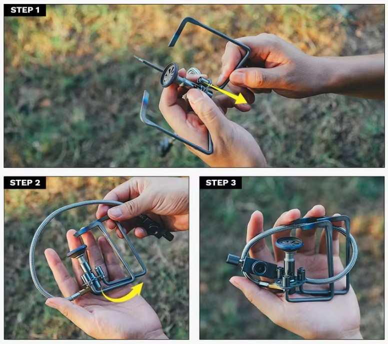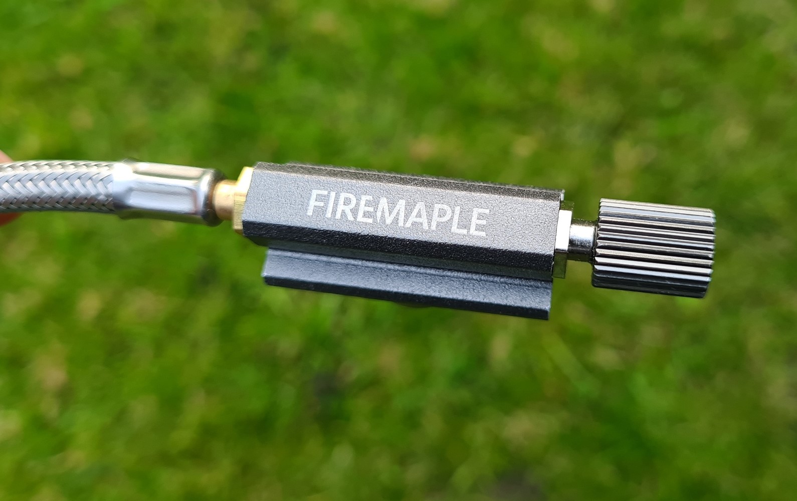 An important factor with remote canister stoves is to have the gas regulator control at the canister end and not at the burner end of the stove. This removes the need to place the hand beneath a hot pot, possibly in the dark, also removing the need to remove a close fitting windshield to adjust the gas. Fire Maple have put a simple 10mm diameter twist knob on the canister valve block. This seems identical to those used on some of the FMS stoves. This is to the extent of threading directly into the aluminium block. There is no copper or brass insert in here and if not taking a little care when screwing a canister on, there is a risk of tearing up the thread. Fire Maple used to include a threaded insert in their valve blocks but there were occasional reported issues with this coming loose, so it was removed entirely for the simpler design. There is an O-ring here and it pays to check this remains in place and is in good condition, possibly even swapping out to a replacement as part of the annual winter gear check. The entire block, with screw adjustment knob, swivels on the fuel hose. This enables a kink free, twist free connection between fuel canister and stove. One and three-quarter turns of the valve move from off to fully open.