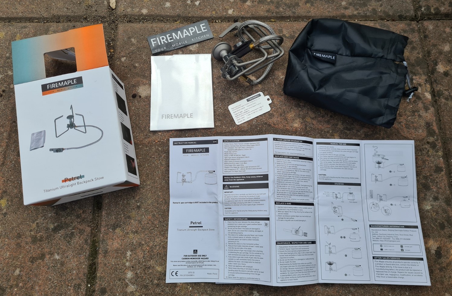 The stoves comes in a card box. Accompanying the stove on purchase is a nylon drawstring baggie, windscreen and instruction sheet, printed in English, German, French and Japanese. The stove has a three-year guarantee. As I write this (2025), it is available in the UK from the Fire Maple website for £41.11, plus shipping, though this price seems to fluctuate a bit.