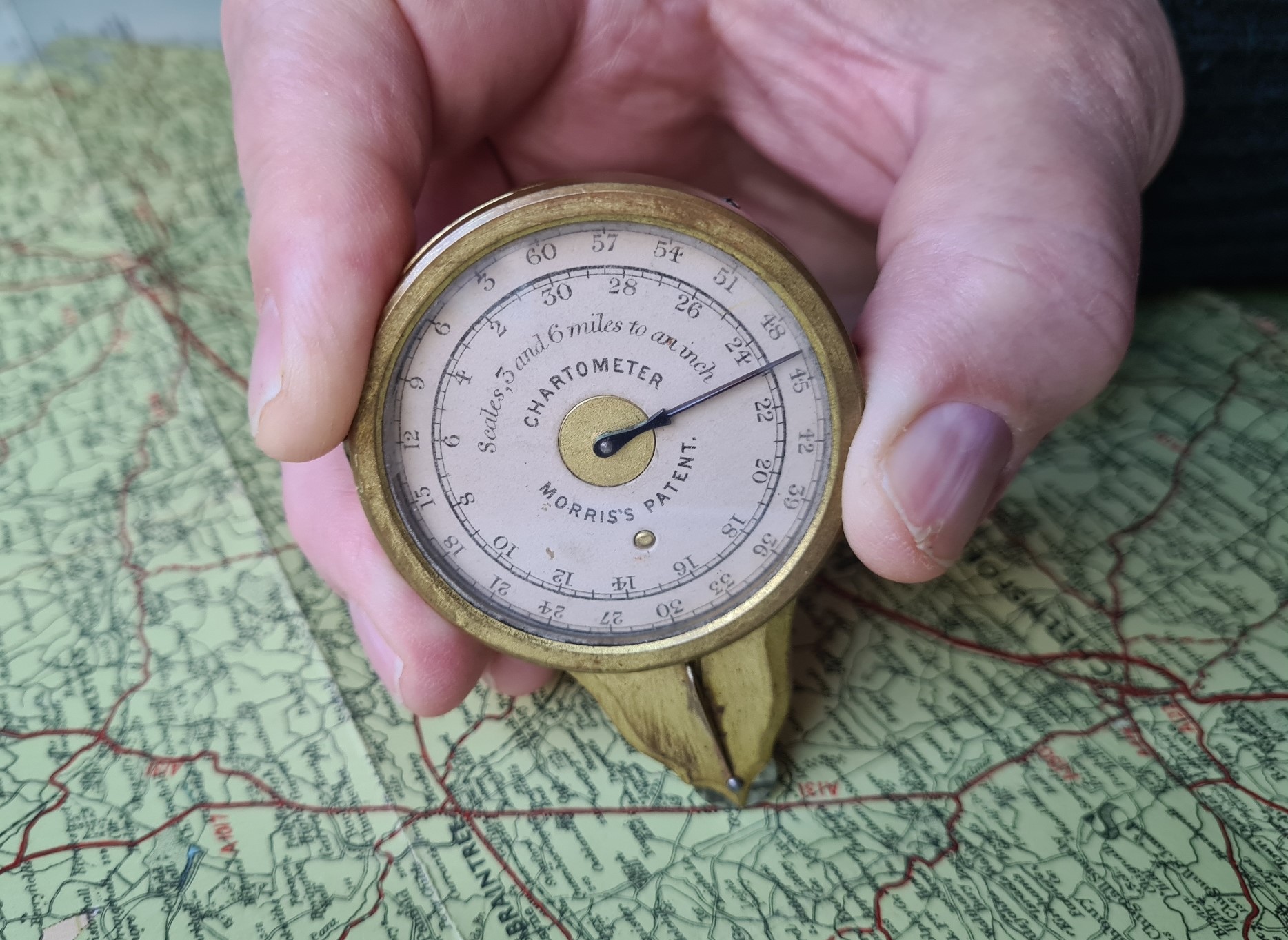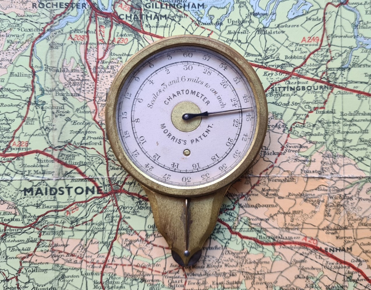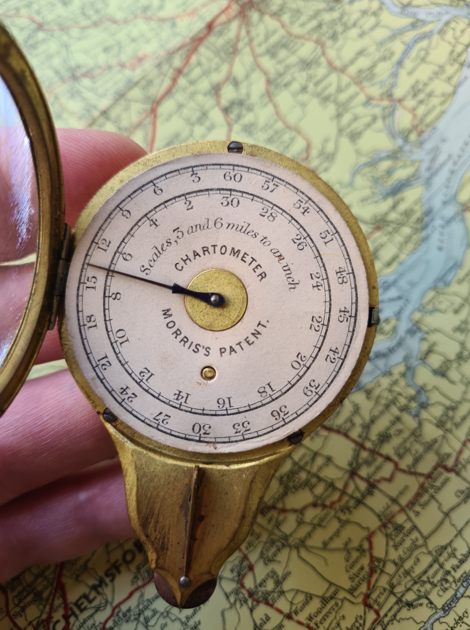 Set against the more commonly encountered map measures seen today, it would be easy to regard this analogue measure as an unsatisfactory anomaly. A bit clunky, a bit difficult to install cards. But that would ignore it’s place right at the start of the creation and development of map measuring instruments that were themselves improving on the simple opisometers that had sufficed until then. Even today, it still works as intended, measuring a route on an appropriate scale map. It is a glorious survivor. This measure has featured as part of an ongoing monthly series where Three Points of the Compass looks at Map Measurers in detail. Links to these can be found here.