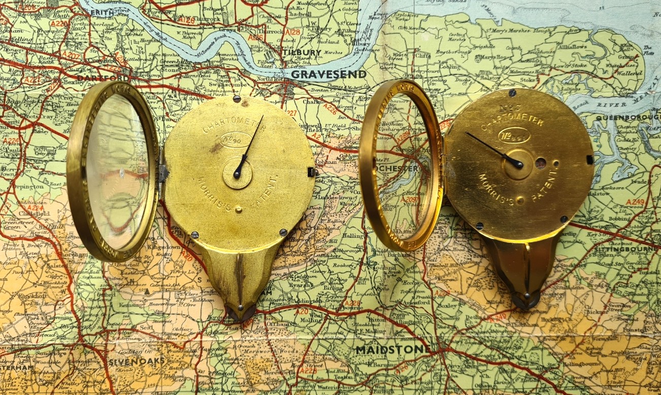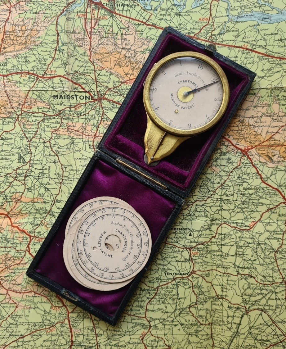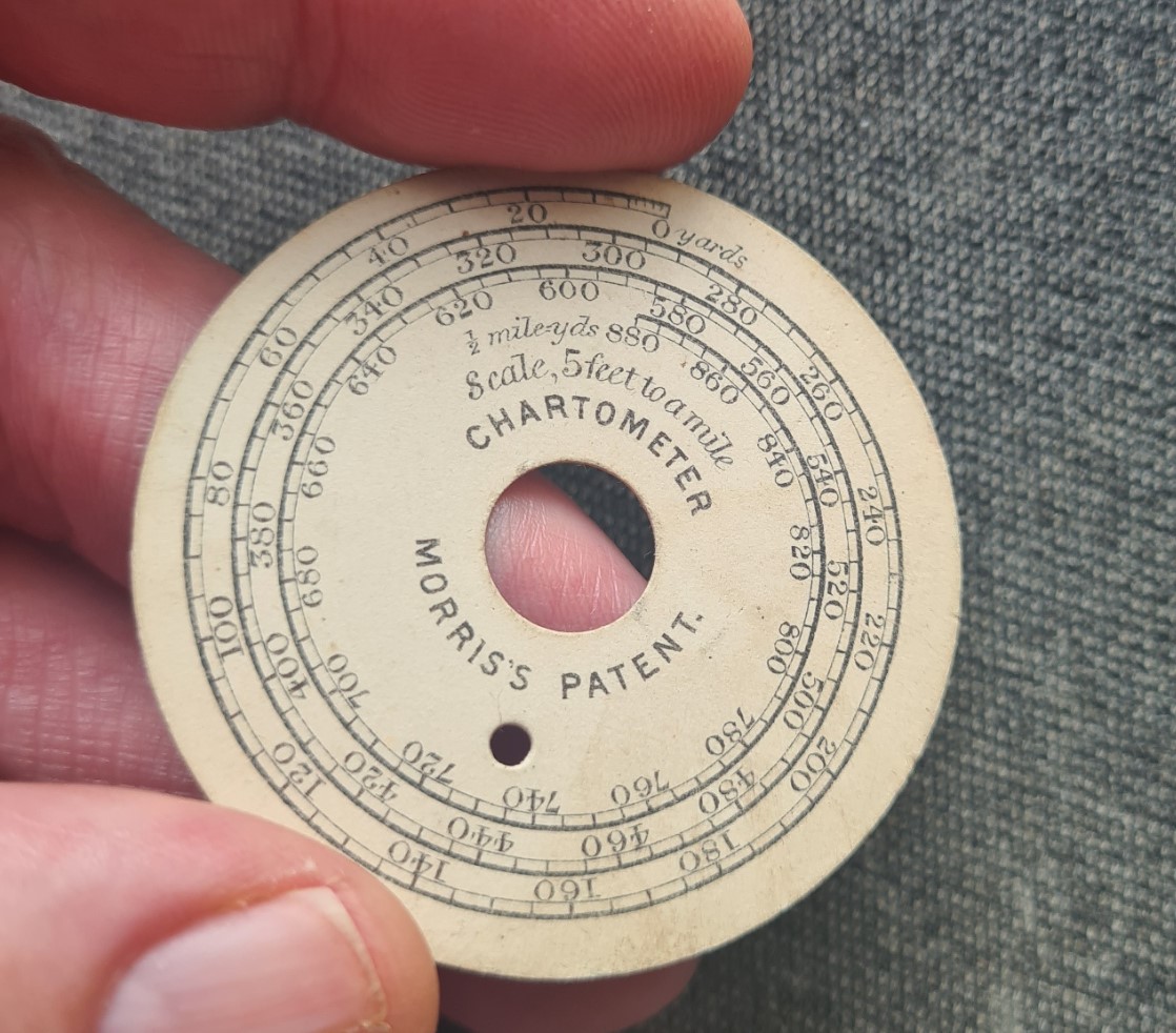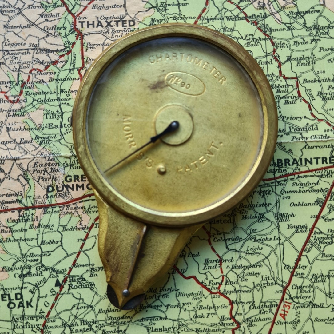 Set against the more commonly encountered map measures seen today, it would be easy to regard this analogue measure as an unsatisfactory anomaly. A bit clunky, a bit difficult to install cards. But that would ignore it’s place right at the start of the creation and development of map measuring instruments that were themselves improving on the simple opisometers that had sufficed until then. Even today, it still works as intended, measuring a route on an appropriate scale map. It is a glorious survivor. This measure has featured as part of an ongoing monthly series where Three Points of the Compass looks at Map Measurers in detail. Links to these can be found here.