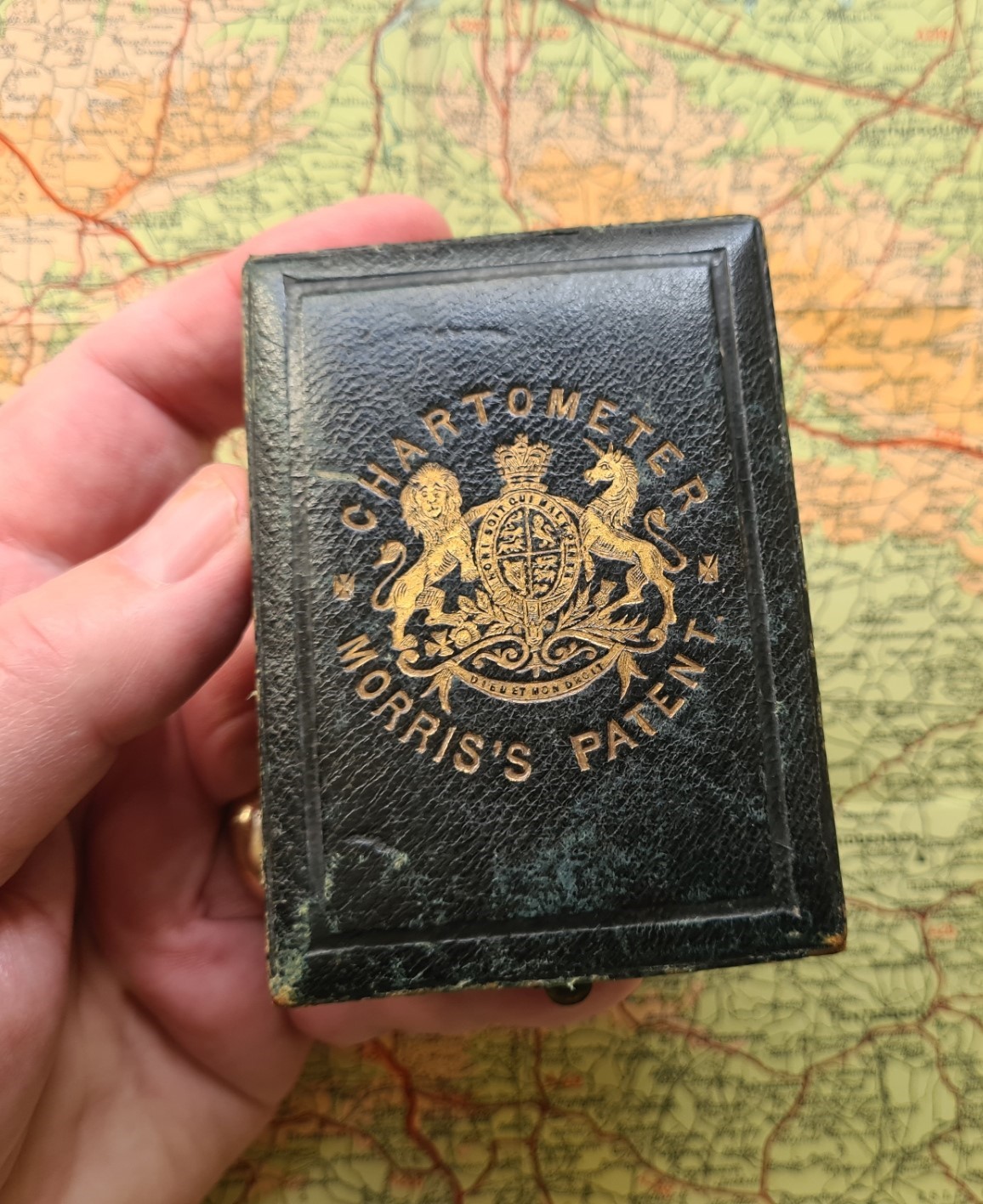 Morris was a member of the Institute of Civil Engineers from 1880 and designed and manufactured map measurers in a range of sizes, this is the largest he produced but not the heaviest. The Chartometer shown here weighs 70g, 10g less than the totaliser version and 14g lighter than Morris’s Measuring Instrument, his next generation of measurer. At 80mm x 57mm x 11.2mm it is quite a sizable instrument.