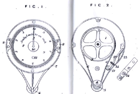 “The only instrument that measures and registers distances on maps, plans, scaled drawings etc, and that is adapted for various scales. By guiding the small steel wheel along any route on a map, the hand registers the actual distance in miles, yards etc, according to the dial in use and the scale of the map, which should correspond. To deal with a map of a different scale, the glass front is opened by pressing a spring; the dial removed, and another corresponding to the fresh scale slipped into its place.”