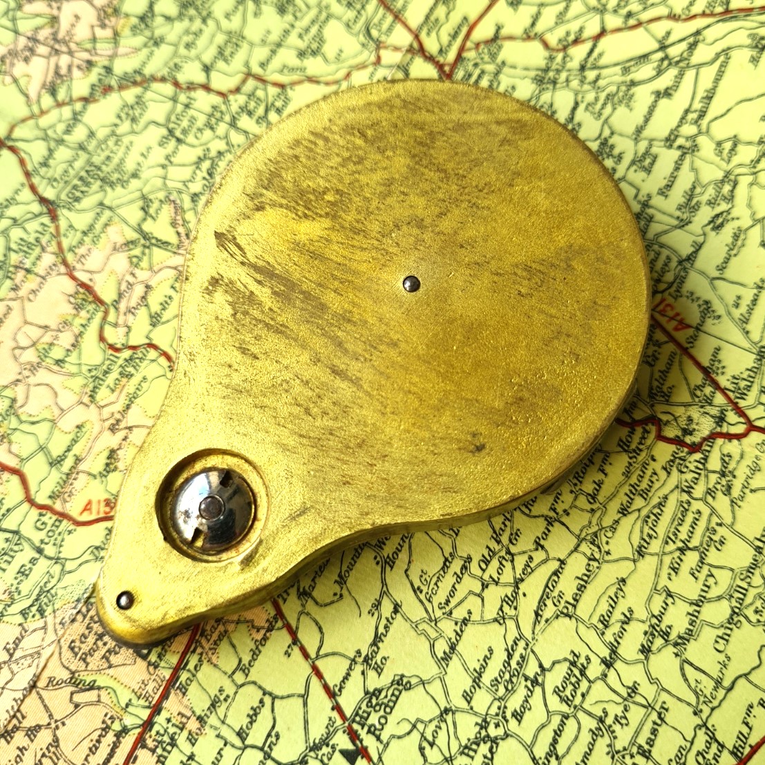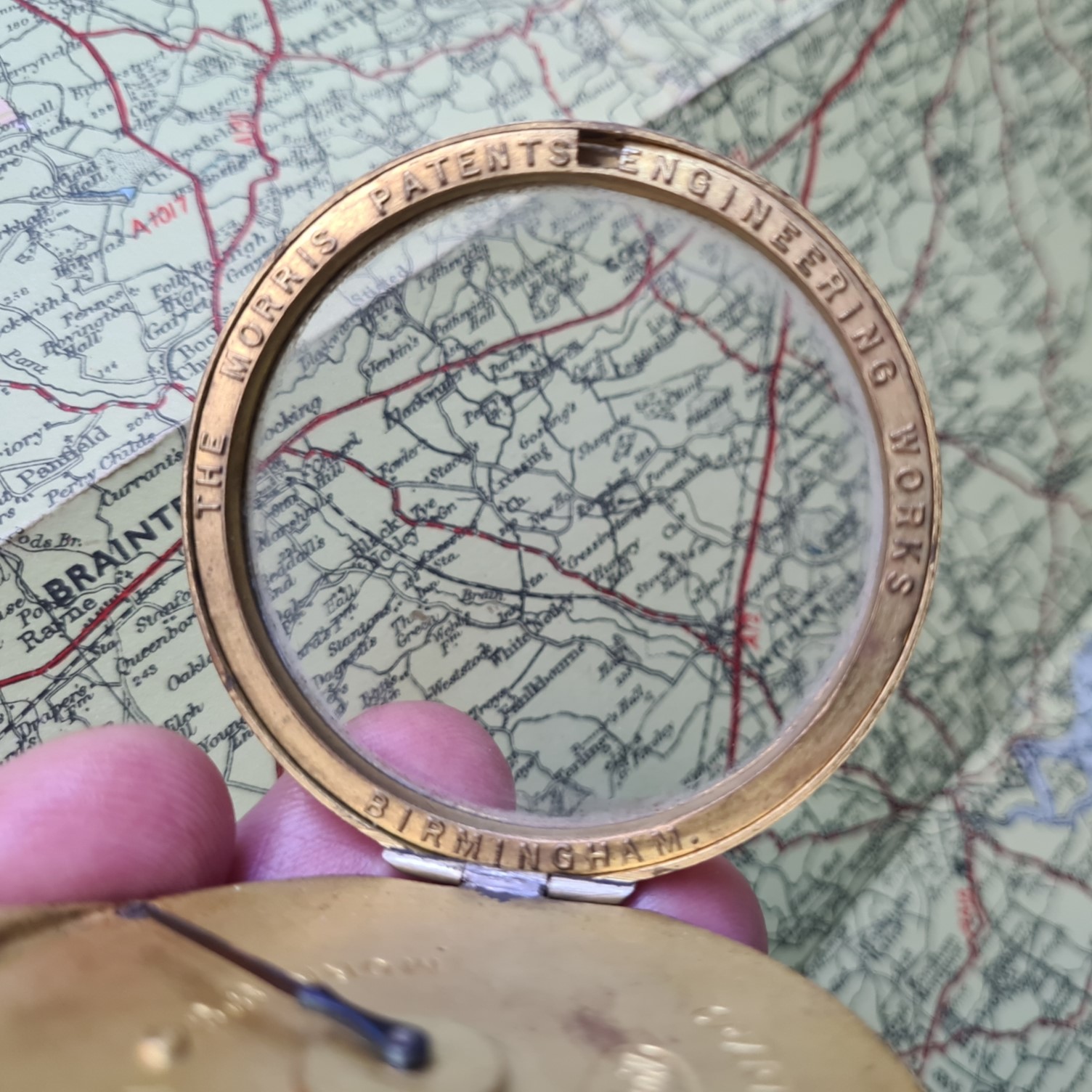 The teardrop shaped brass case of the Chartometer has a hinged glass front opened by a press button catch on the side. On the underside of the glass front are the words THE MORRIS PATENTS ENGINEERING WORKS BIRMINGHAM. On the front of the case, below where the scale dial would normally sit, are the words CHARTOMETER MORRIS’S PATENT. There is also an oval, in which the No is universally included. Each of the instruments had a unique number, this example is number 90. With the desired scale card inserted and hinged front closed, the measure is held in the hand and the steel wheel at the bottom rolled along a line on a scale map or drawing. The measurement is then read off against the scale card. Morris also produced a Chartometer with a removable top cover, that could be locked to the case by two twist catches.
