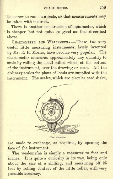 “A set of dials adapted to the scales of all Ordnance maps, and the usual scales of travelling maps etc, is contained in a recess of the leather case, beneath the instrument.”