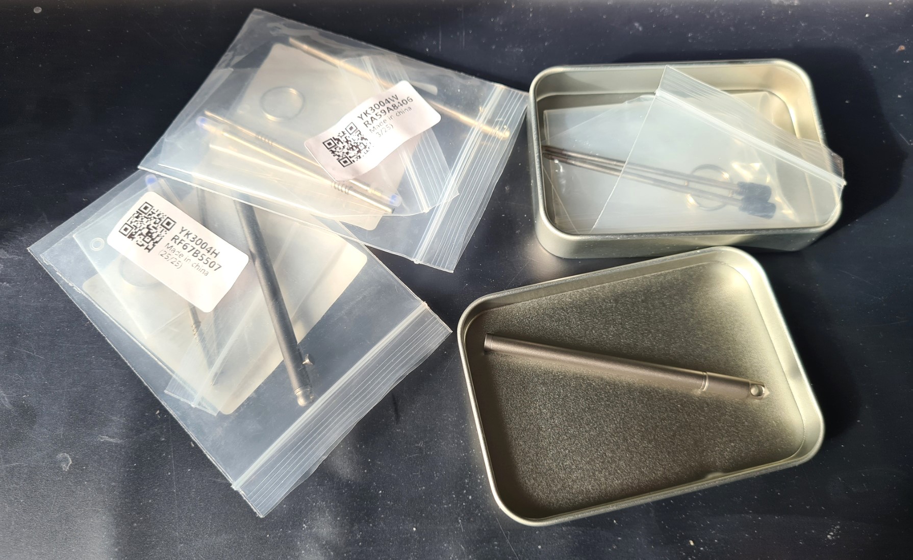 Ever wasteful and I know my soul is damned, I then ordered two more pens to compare the three. An identical bolt action pen in a different finish, and a much simpler little pen, with screw on cap over the ballpoint pen tip. That last one cost me £6.60, with another £1.23 for shipping. It also came with two spare refills and a split ring, all in a little metal tin made of undefinable metal, ideal for making a mini EDC kit. I note that today (November 2025), it is retailing at £4.41, with £1.24 shipping to the UK.