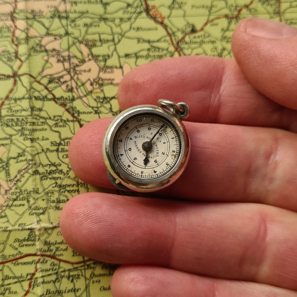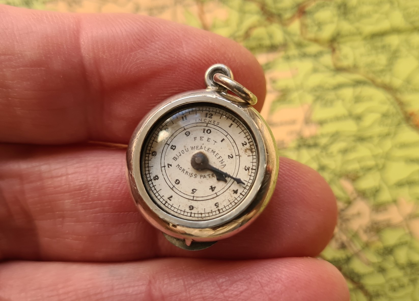 Morris was a member of the Institute of Civil Engineers from 1880 and designed and manufactured five types of map measure. The Bijou Wealemefna was the smallest measure that he produced and weighs just 7.8g. It really is quite tiny, measuring 22.2mm in diameter and 7.15mm deep. Held between a single finger and thumb, it is easy to use.