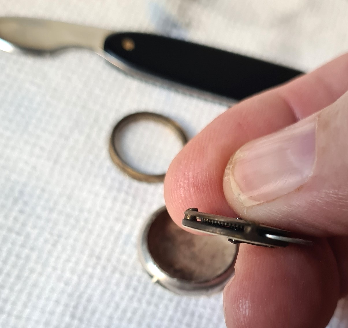Opening the case reveals the internal workings, such that there are, squeezed between backplate and measuring dial. The tracking wheel drives one large(ish) toothed gear that meshes with the driving cog for the hand movement. With the important parts made of brass and steel and with little to go wrong, it is unsurprising that the movement is still operating well and smoothly after a century and half.