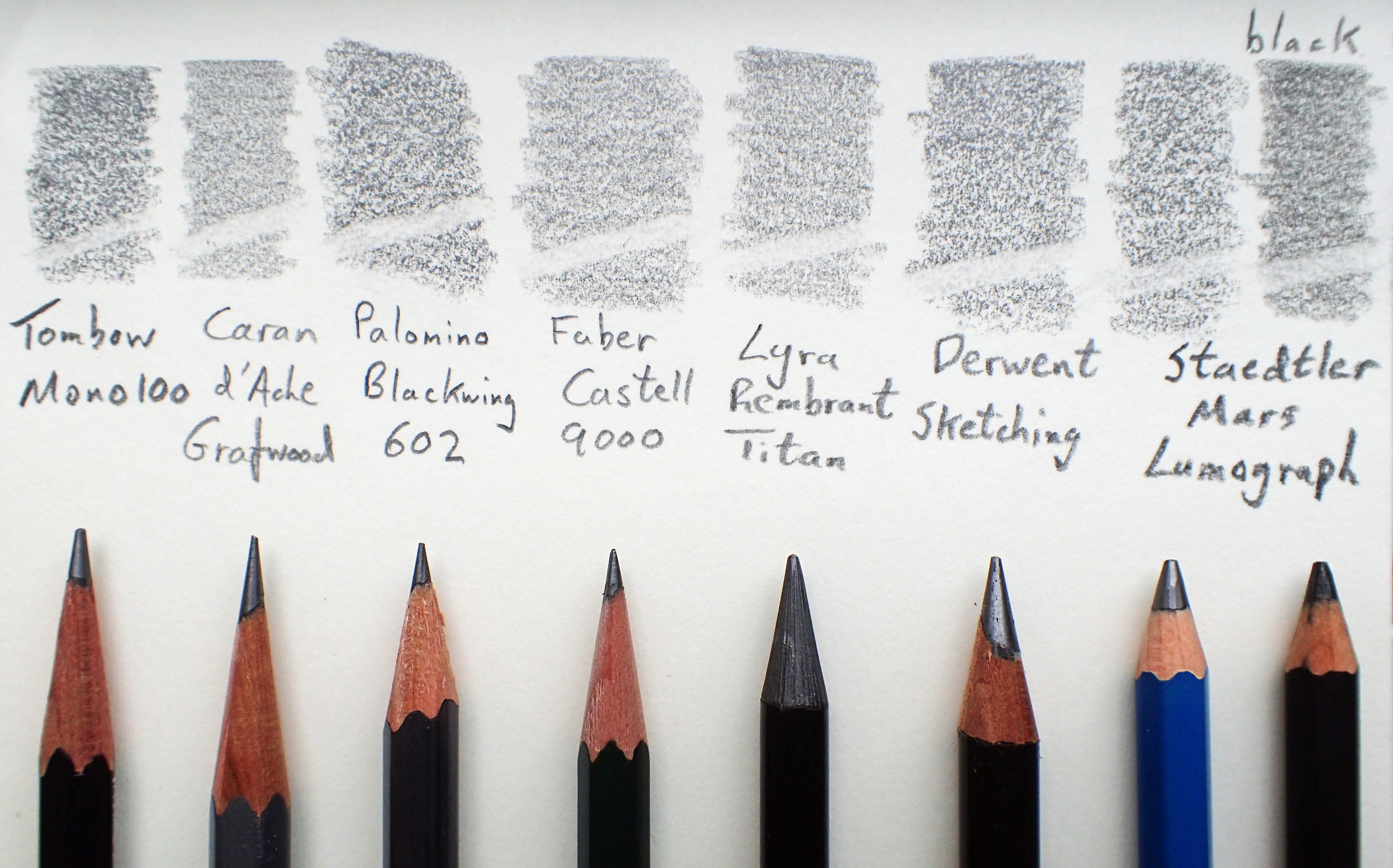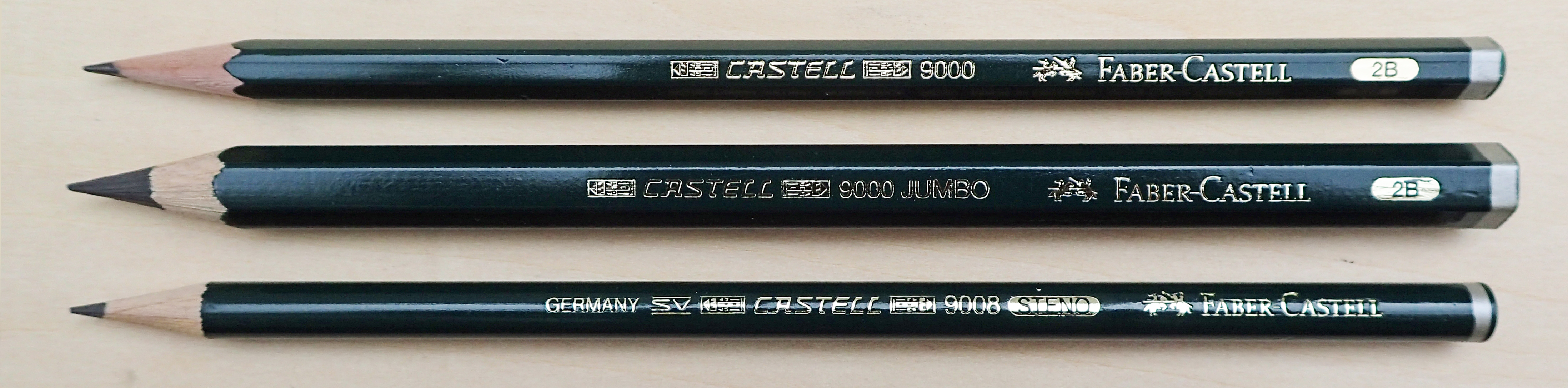 The above 9000 series pencils from Faber Castell are a good and easily available (in Europe) option. I find the graphite to be of a consistently high quality with no grittiness. If wishing to include an eraser, then the shorter ‘Perfect Pencil’ replacement from Faber Castell could be taken. This is a shorter pencil that will easily last a fortnight but is only purchased as a B grade. As to the Perfect Pencil itself, most other pencils, of any grade, could be slipped into the extender/sharpener that comes as part of it.