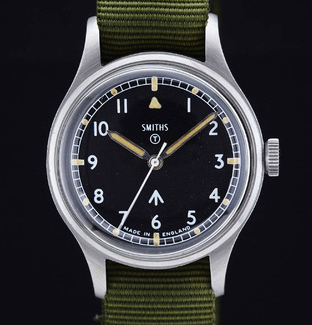 The Smiths W10 was also the last ever British made watch issued to the British Armed Forces. It was ideally suited and perfectly functional, though perhaps a little small (35mm) for many peoples taste today. Black face with simple, luminous indicated, Arabic numerals and luminous hands. One advantage that a military watch has over most other types are the fixed lugs. These do not have spring loaded pins to hold a strap in so there is virtually no chance of your watch coming adrift and being lost while you are totally oblivious. The strap had to be threaded through non-removable pins. The Smiths brand is now owned by Timefactors who produce a modern replica- the PRS29A (or the PRS29B). Smiths also made the speedos for my BSA D10 and A65 motorcycles that I had at the same time. I do wish I still had both motorcycles and the watch. Sad losses.