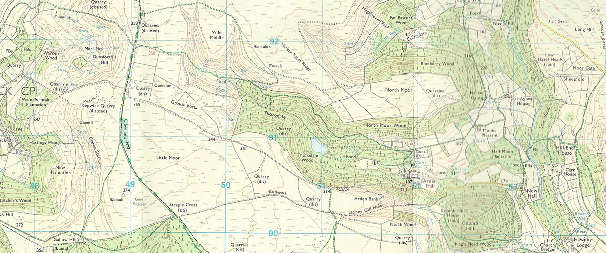 The 1983 1:25 000 Ordnance Survey North York Moors Outdoor Leisure sheet is a deceptively simple and clear map. Use of colour is primarily reserved for woodland and bodies of water. Elevation being indicated by contours