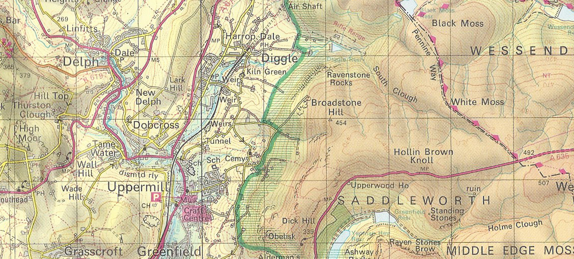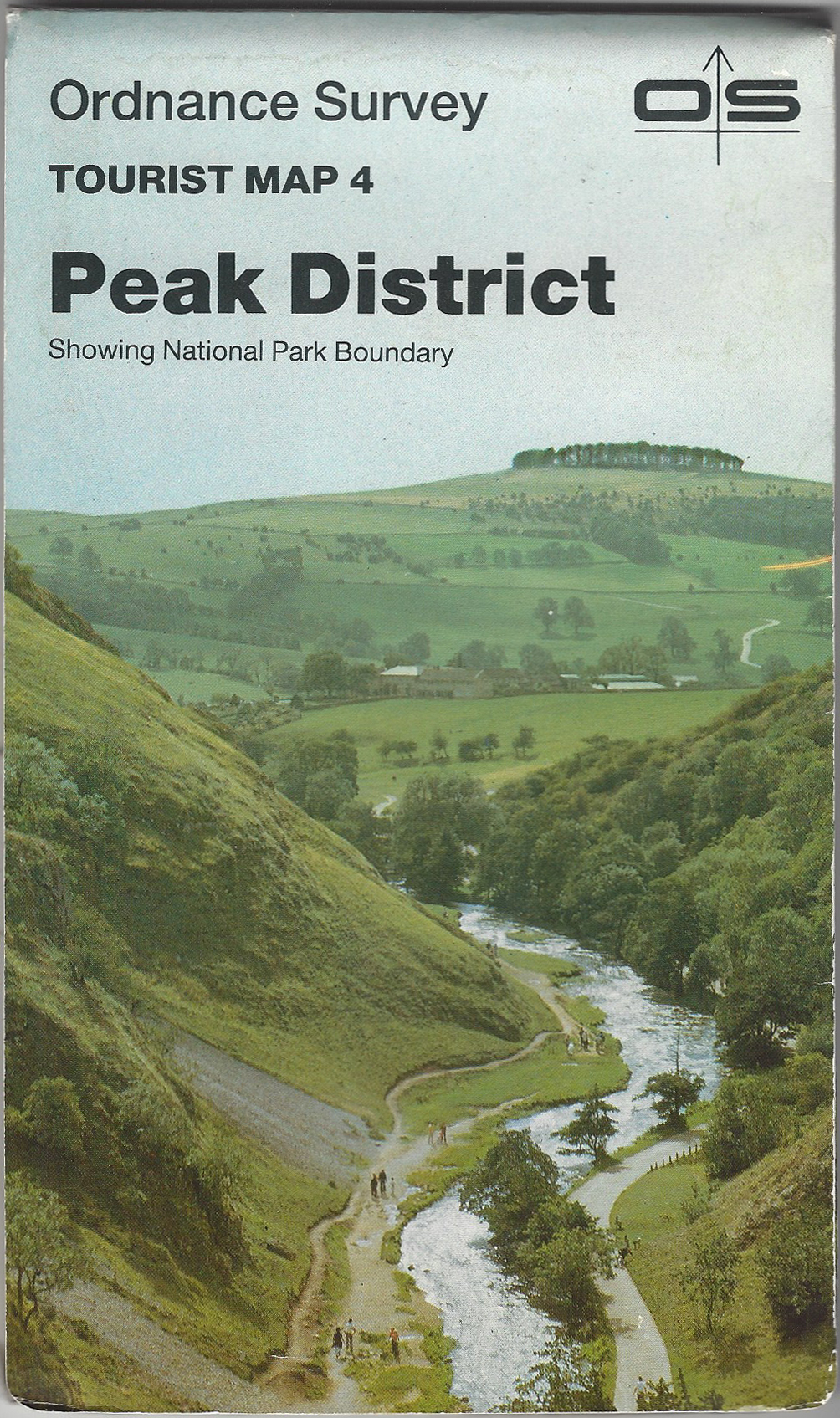 A change in the use of colour shading. Other than green for woodland, shading mostly represented elevation above sea level. Ordnance Survey Tourist Map of the Peak District, 1986