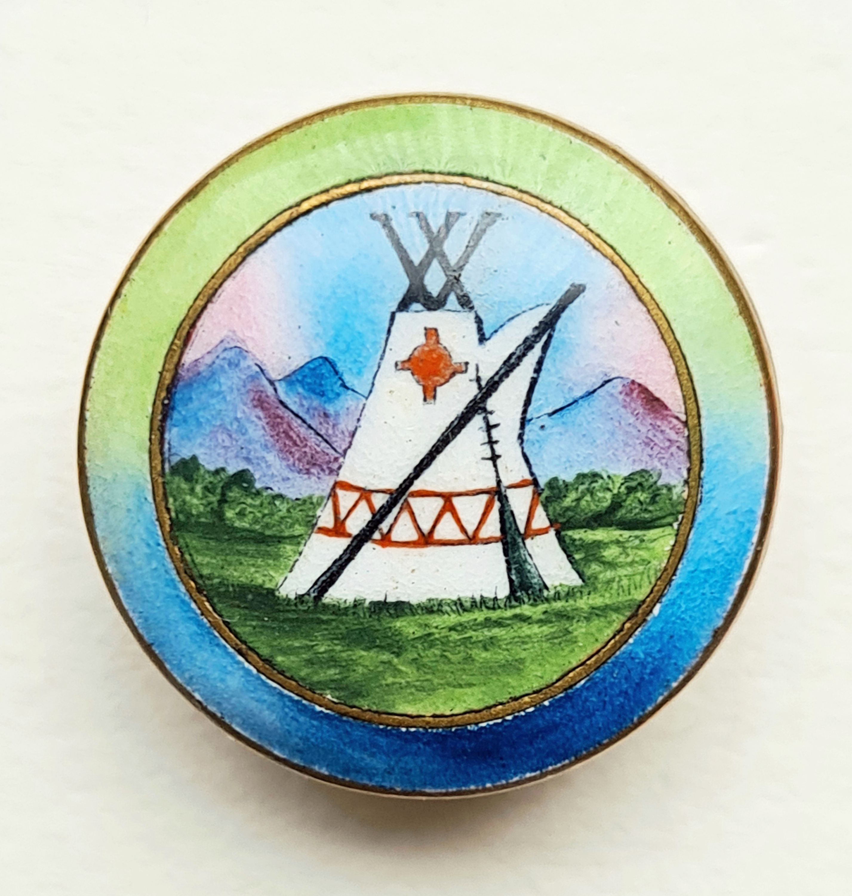 Hand painted enamelled Camping Club badge. 1920-1954. Crescent stud buttonhole fastening. 22.25mm. Maker- J R Gaunt