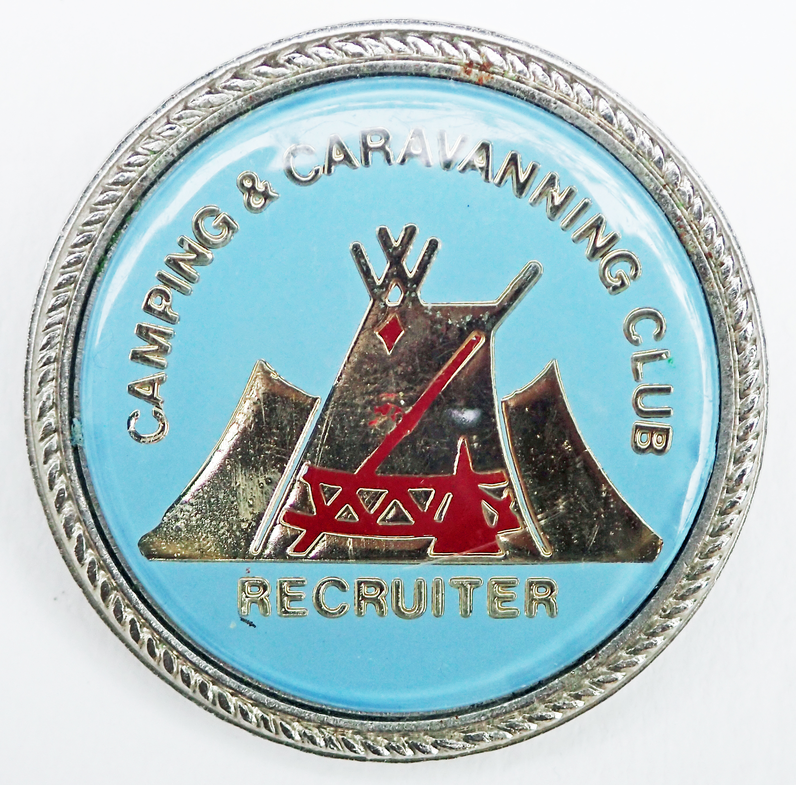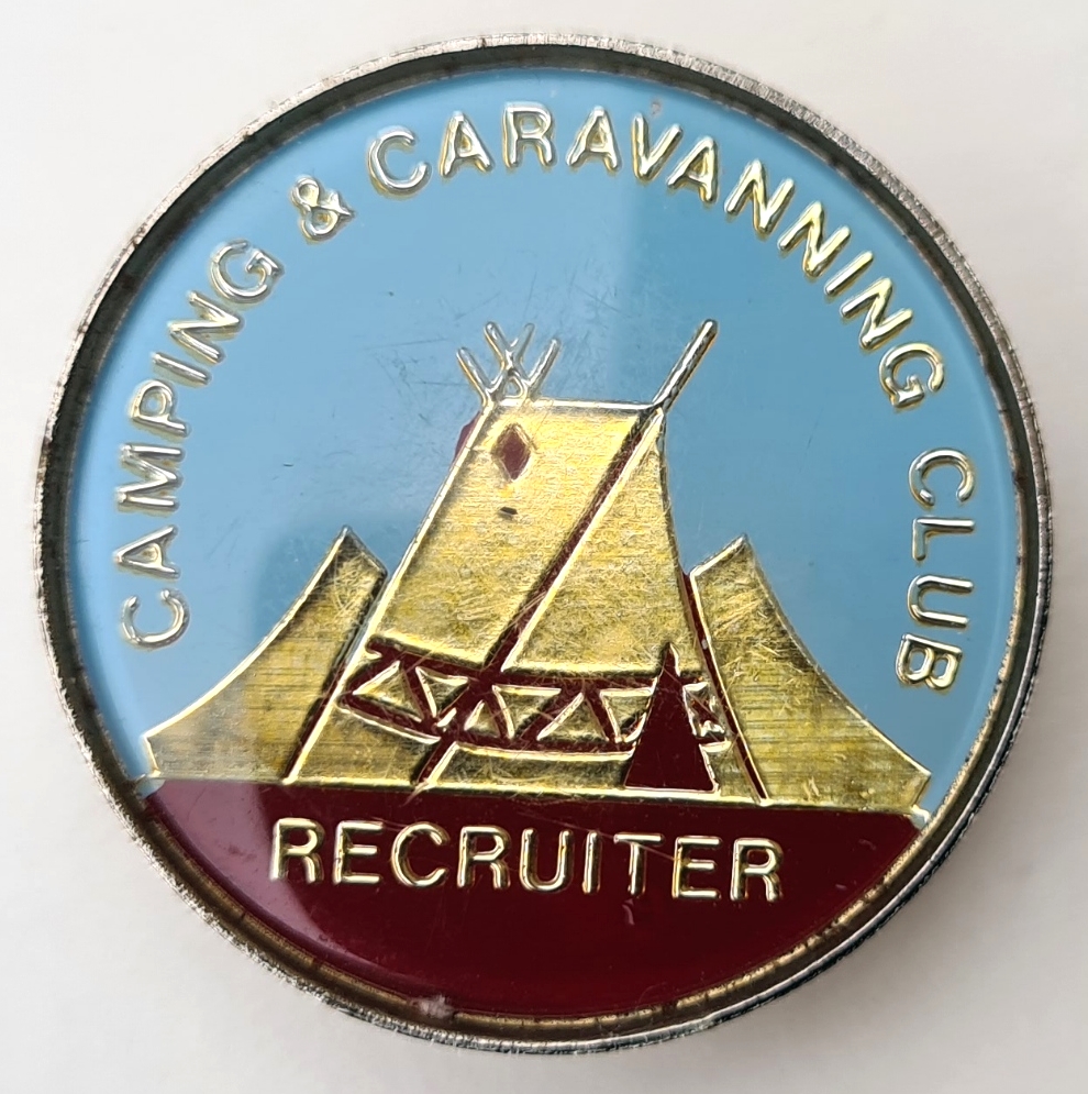 Camping & Caravanning Club Recruiter badge. Post 1983. Patterned edge. Pin back. 29.50mm. No maker’s name