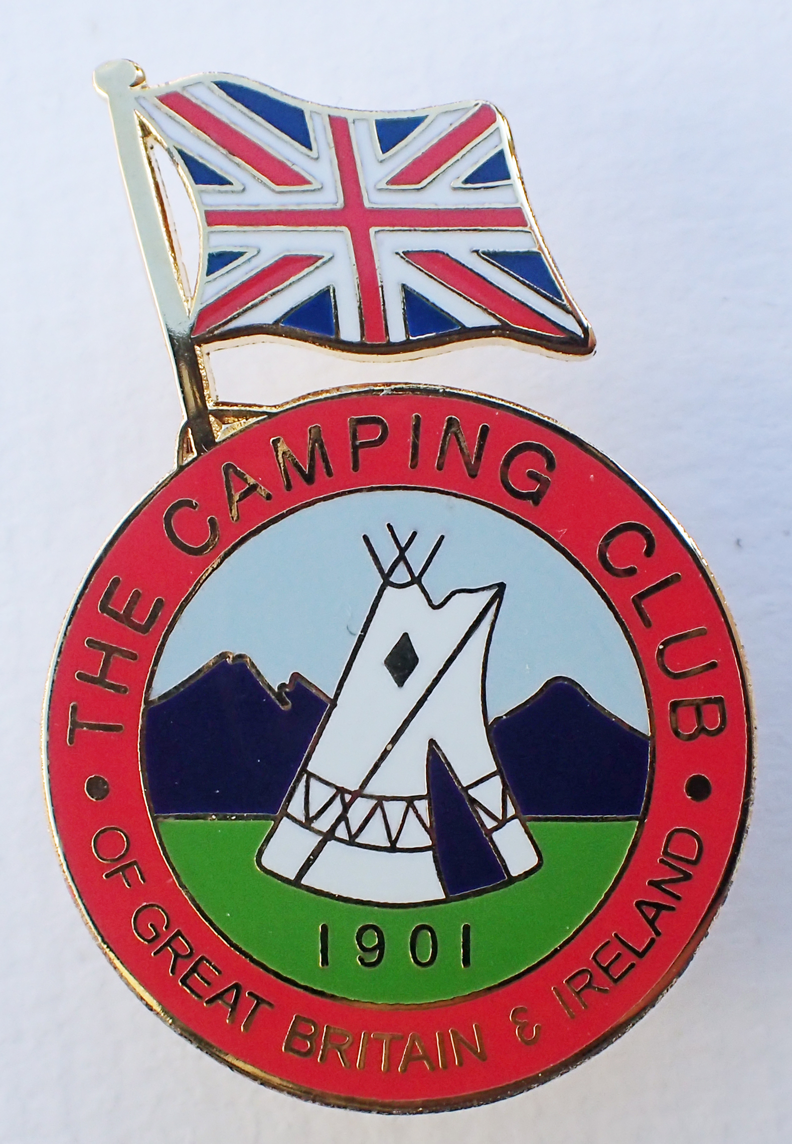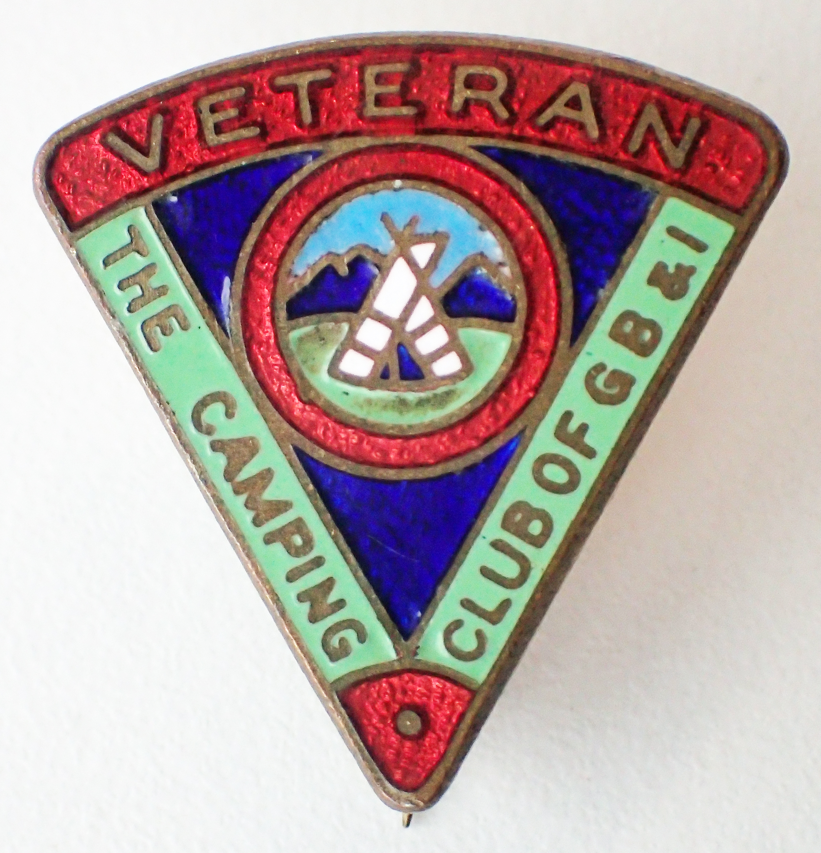 The Camping Club of Great Britain & Ireland. International enamelled badge for use at overseas rallies. 1950-1964. Brooch pin back (no crescent stud version of this badge was made). 23.30mm x 34mm. Maker- Gaunt. Cost three shillings.