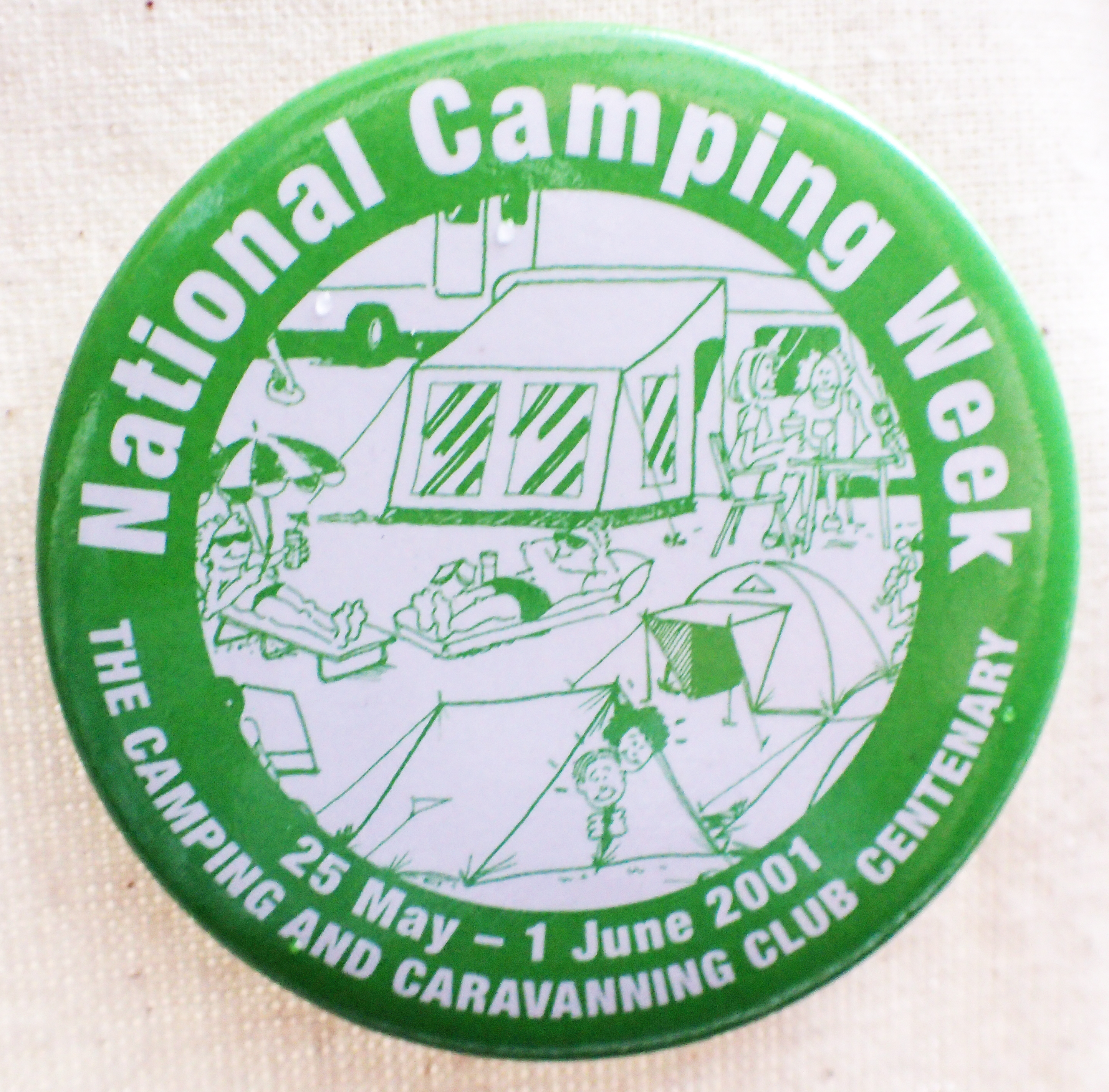 National Camping Week. 2001, club centenary. Pin back button badge. 55mm. No makers name