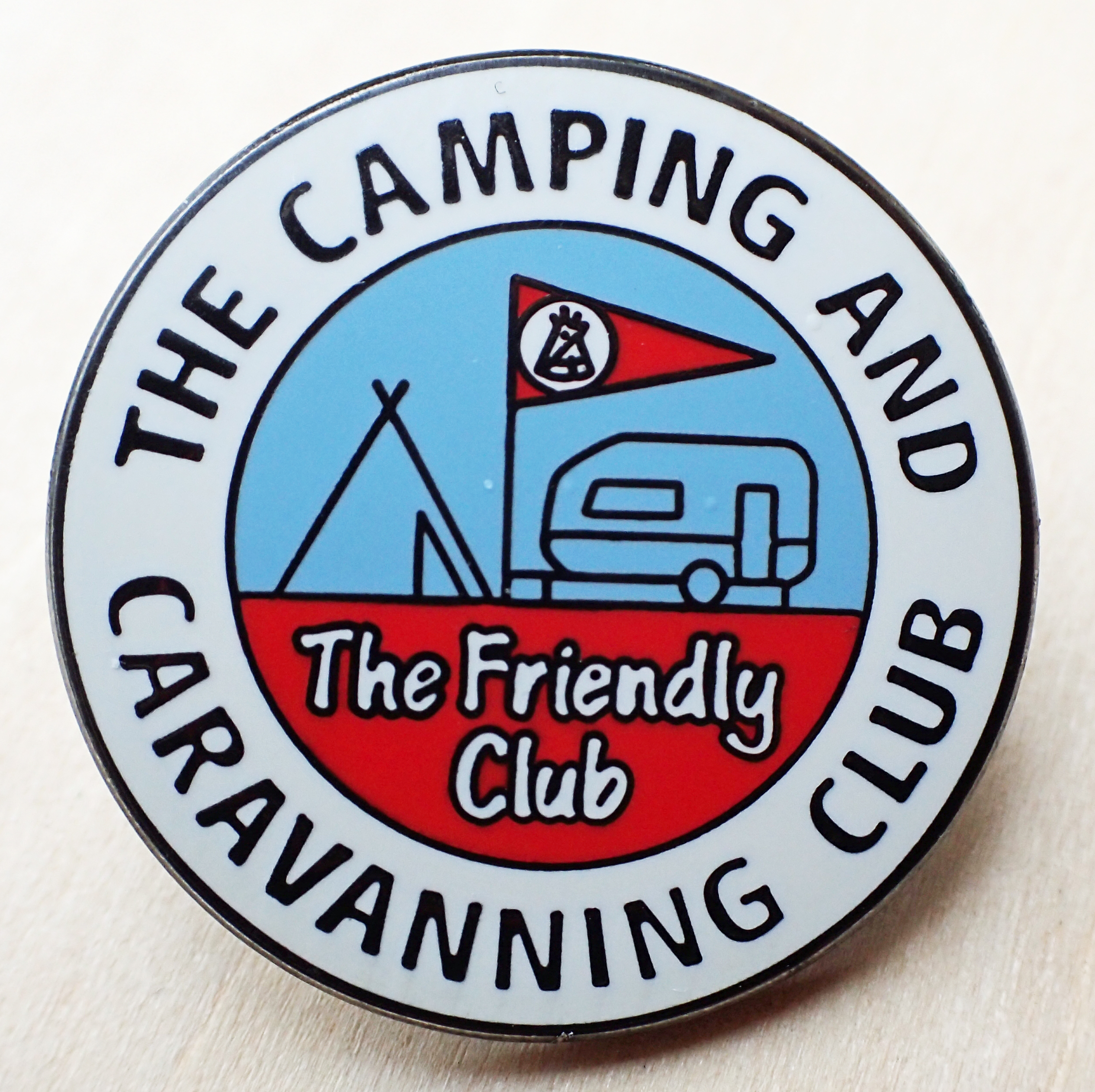The Camping and Caravanning Club badge, post-1983. Brooch pin with safety wheel. 23.75mm. Maker: Toye UK (www.toye.com). Note white infill below caravan towbar