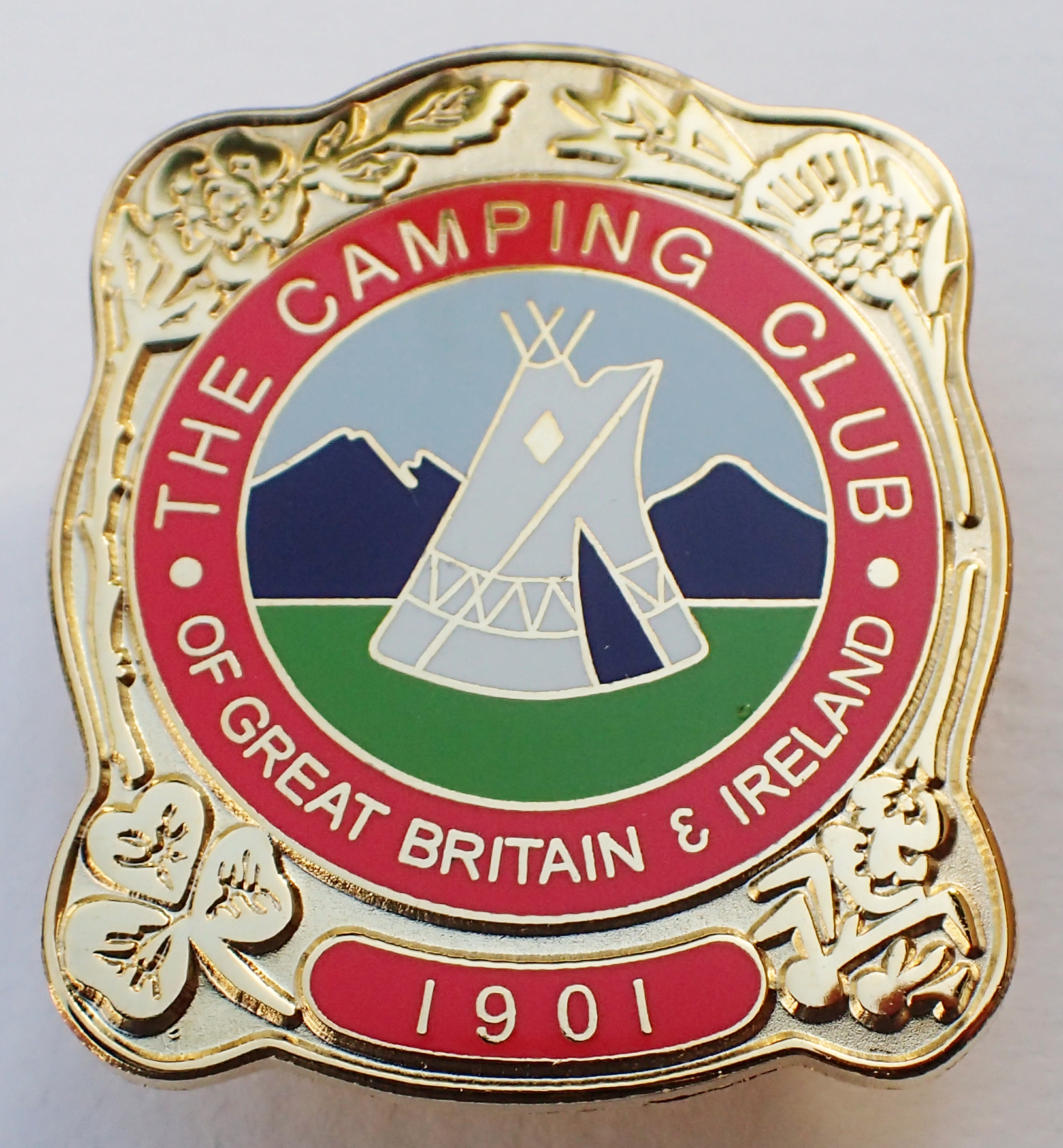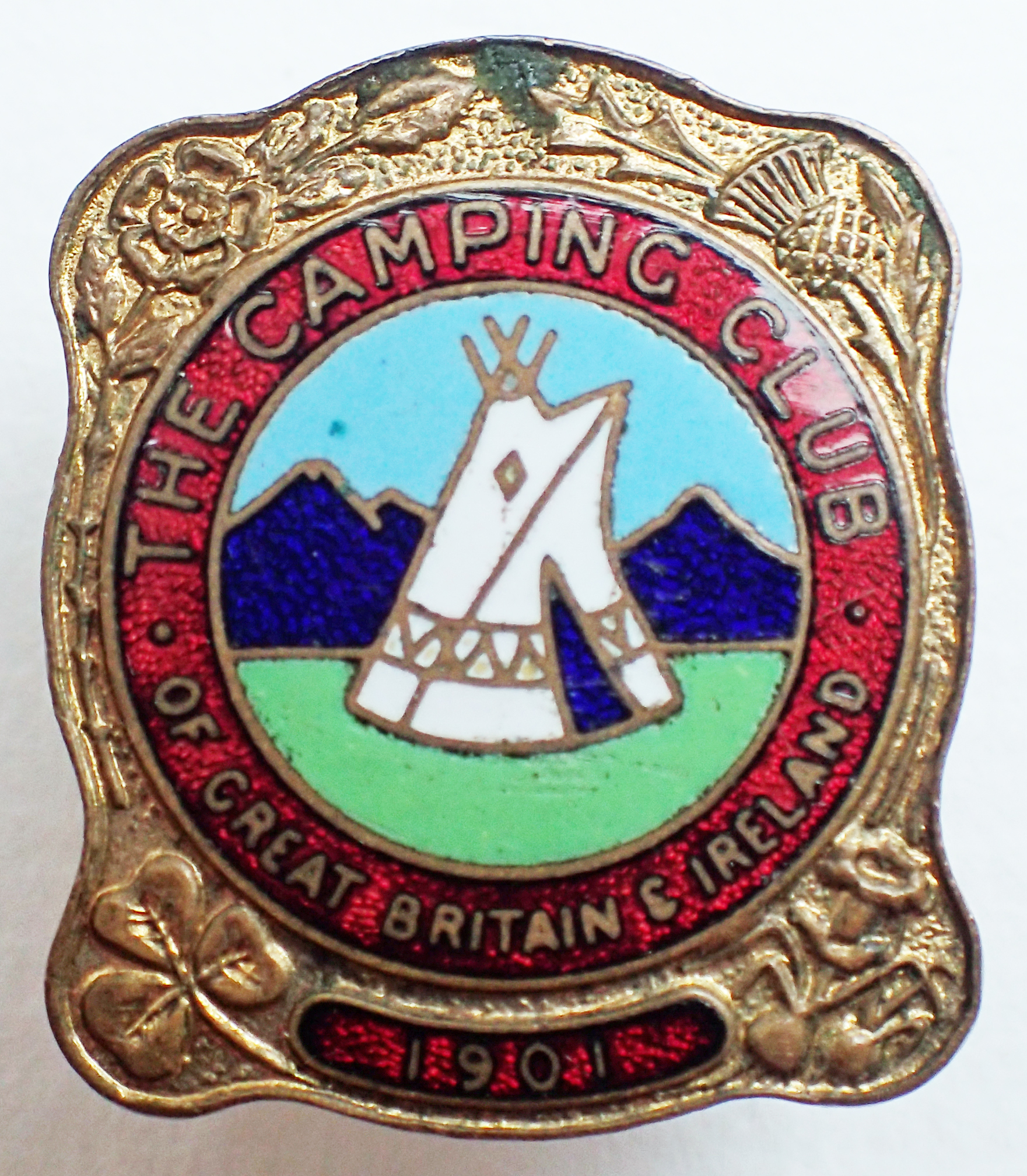Miniature enamel and brass badge with gilt surround given to new members as a goodwill gesture and for presentation to friends as souvenirs. Also available for members to buy, costing two shillings and nine pence each. 1950-1964. The Camping Club of G.B.&I 1901. Note ‘four-nations’ corner decoration. Crescent stud buttonhole fastening. 16.40mm x 19.25mm. Maker- J R Gaunt