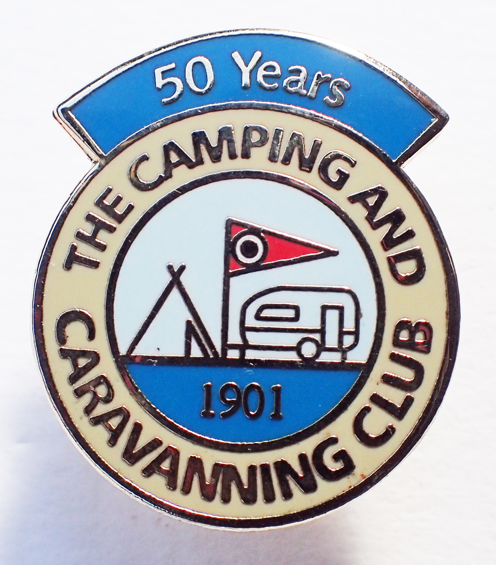 50 Years membership of the Camping and Caravanning Club. Post 1983. Brooch pin with safety wheel. 25.30mm x 22.15mm. No maker’s name