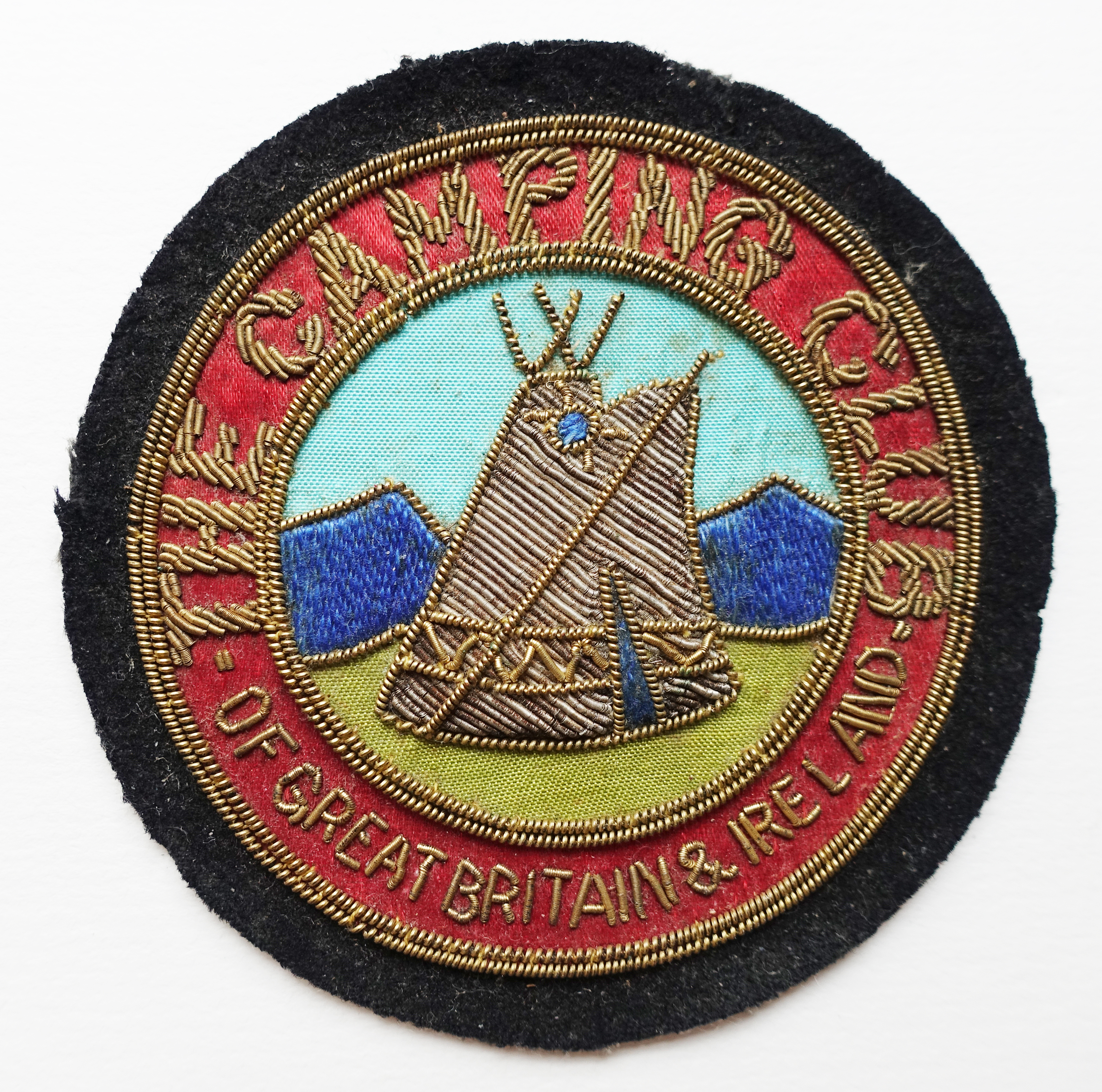 Cloth badge- The Camping Club of Great Britain & Ireland. Pre 1983 76mm diameter. Silk detail. Cost in 1959 £4 shillings and 3 pence,