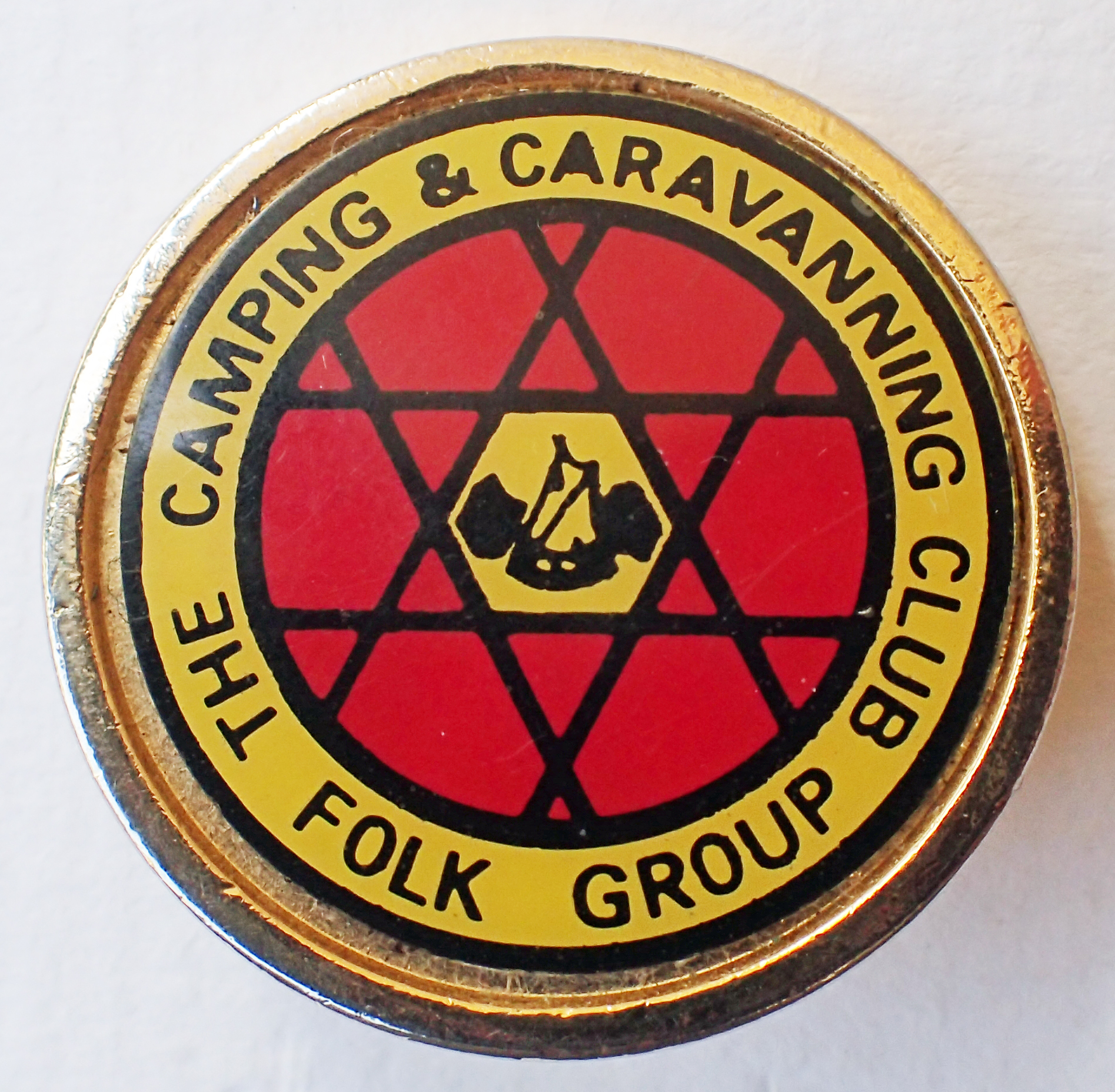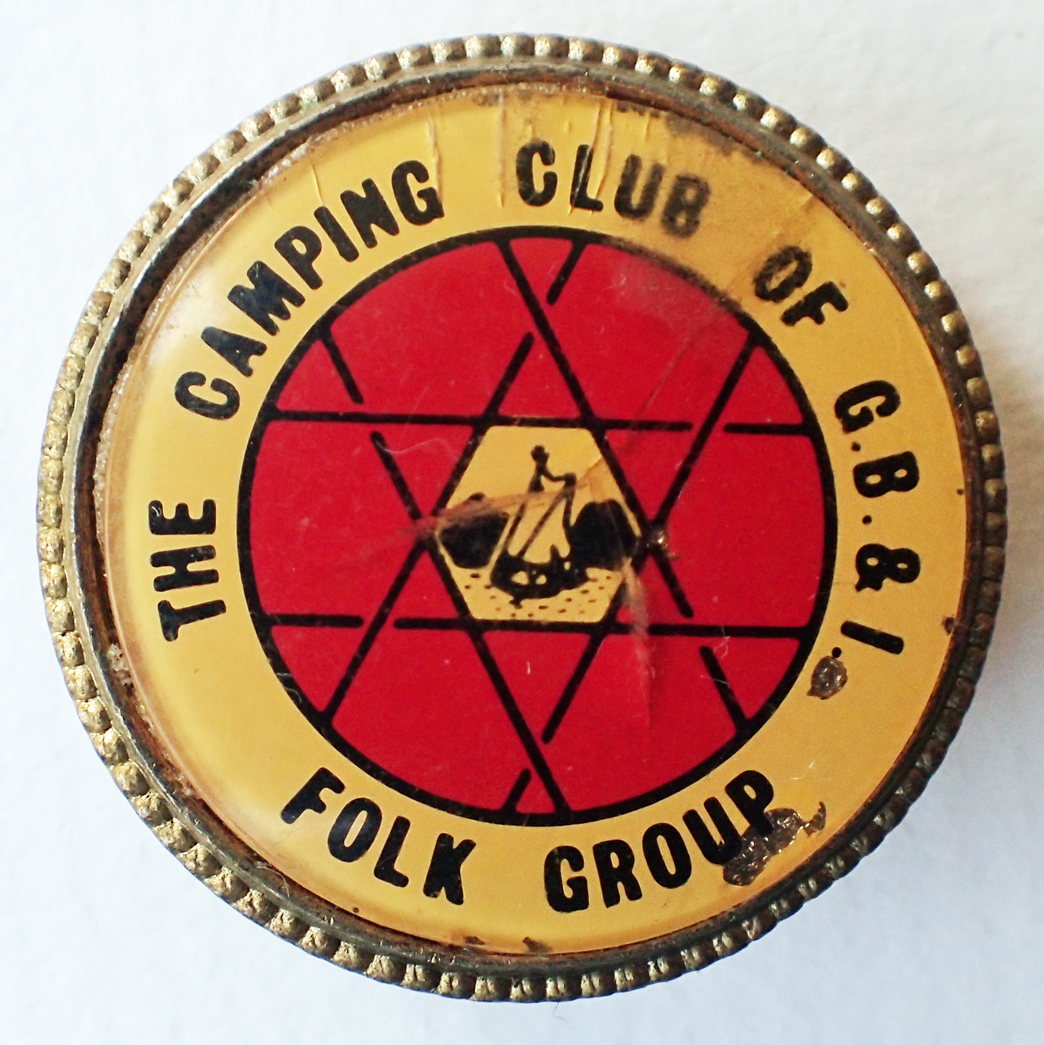 The Camping Club of G.B. & I. Folk Group. Acrylic on brass. Patterned gilt surround. Pre 1983. Pin back. 29mm. No maker’s name