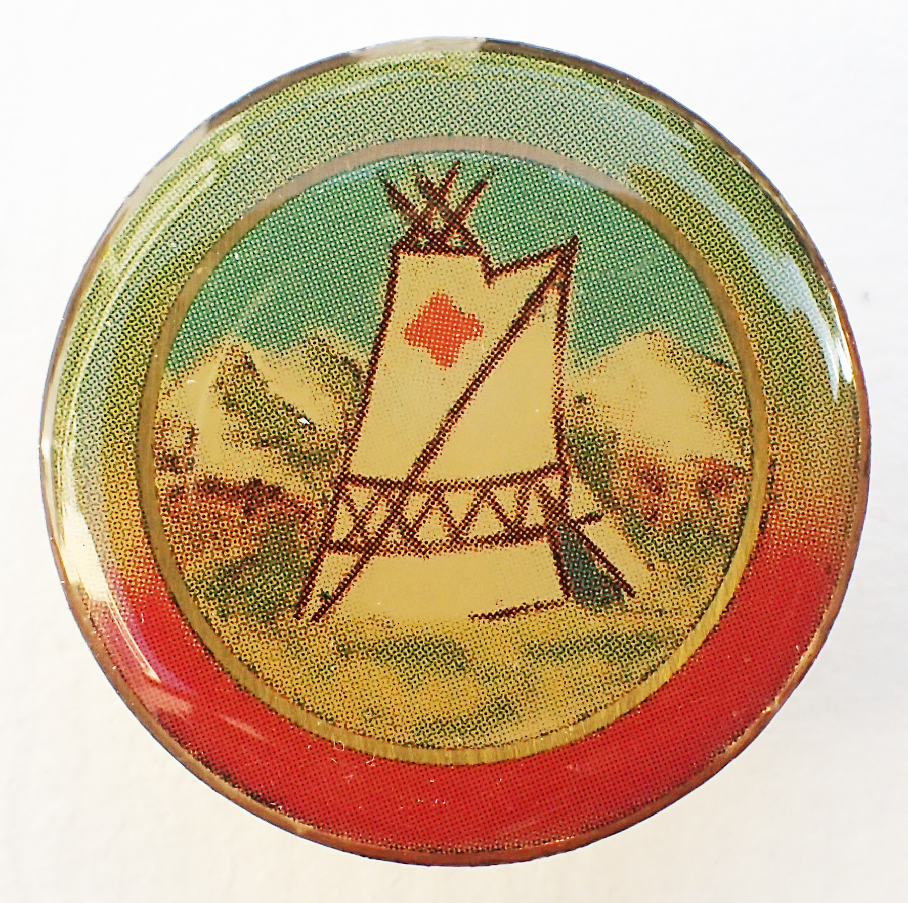 The Camping & Caravanning Club Folk Group. Acrylic on brass. Plain gilt surround. Post 1983. Pin back. 29mm. No maker’s name. ” British Made” on back