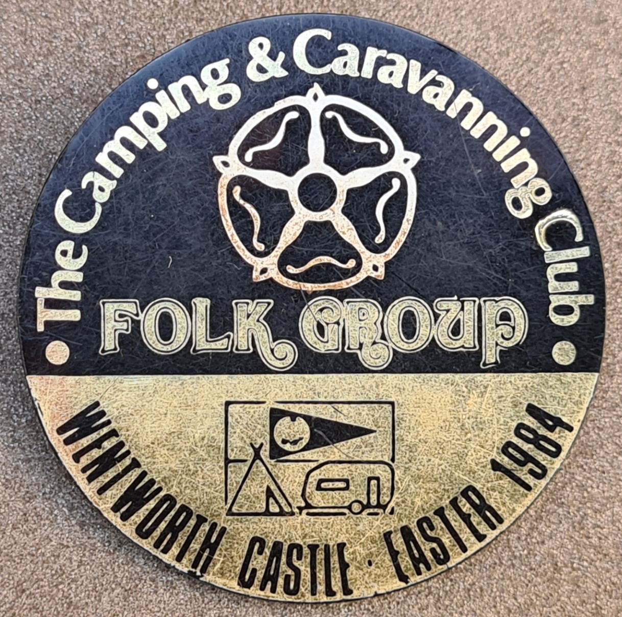 The Camping & Caravanning Club Folk Group. Whitworth Castle Easter 1984. Plastic badge. Black and gold. Note that rose is white, as in the White Rose of York. Glued on brooch pin with safety wheel. 47.65mm. No maker’s name.
