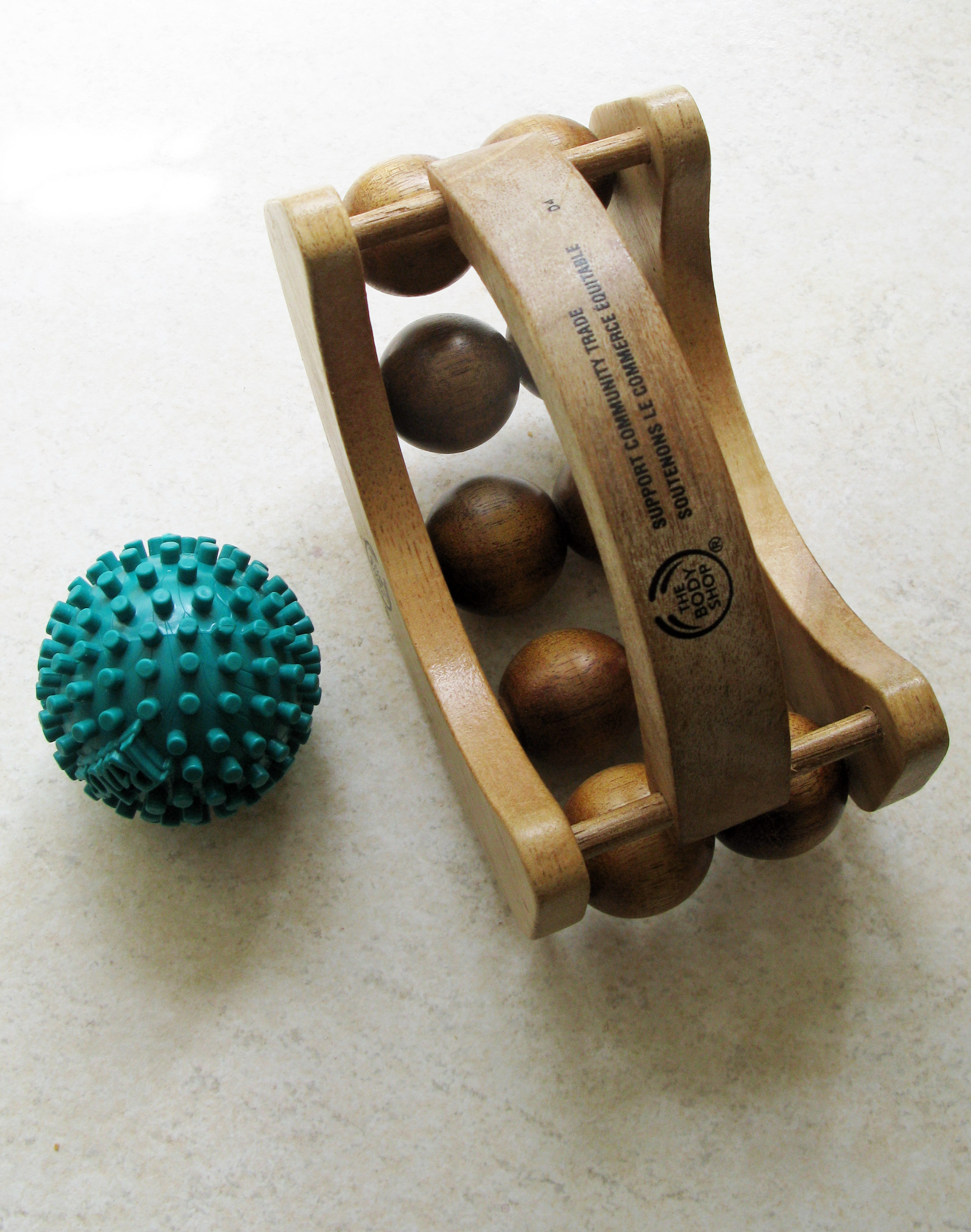 I was able to locate two foot massagers that work quite well for me though possibly not for everyone. One was a Foot Rubz from Due North- this is a small hard ball made of PVC with 160 nubs around the surface. Rolling this below the foot does massage the muscles and works well in the office or sitting at the computer at home. However I feel that I get more benefit from a 100% wooden massager from The Body Shop. Rolling this across the sole in different directions really does work into the muscles and sinews. I use this before a deep massage of the plantar fascia with the fingers.